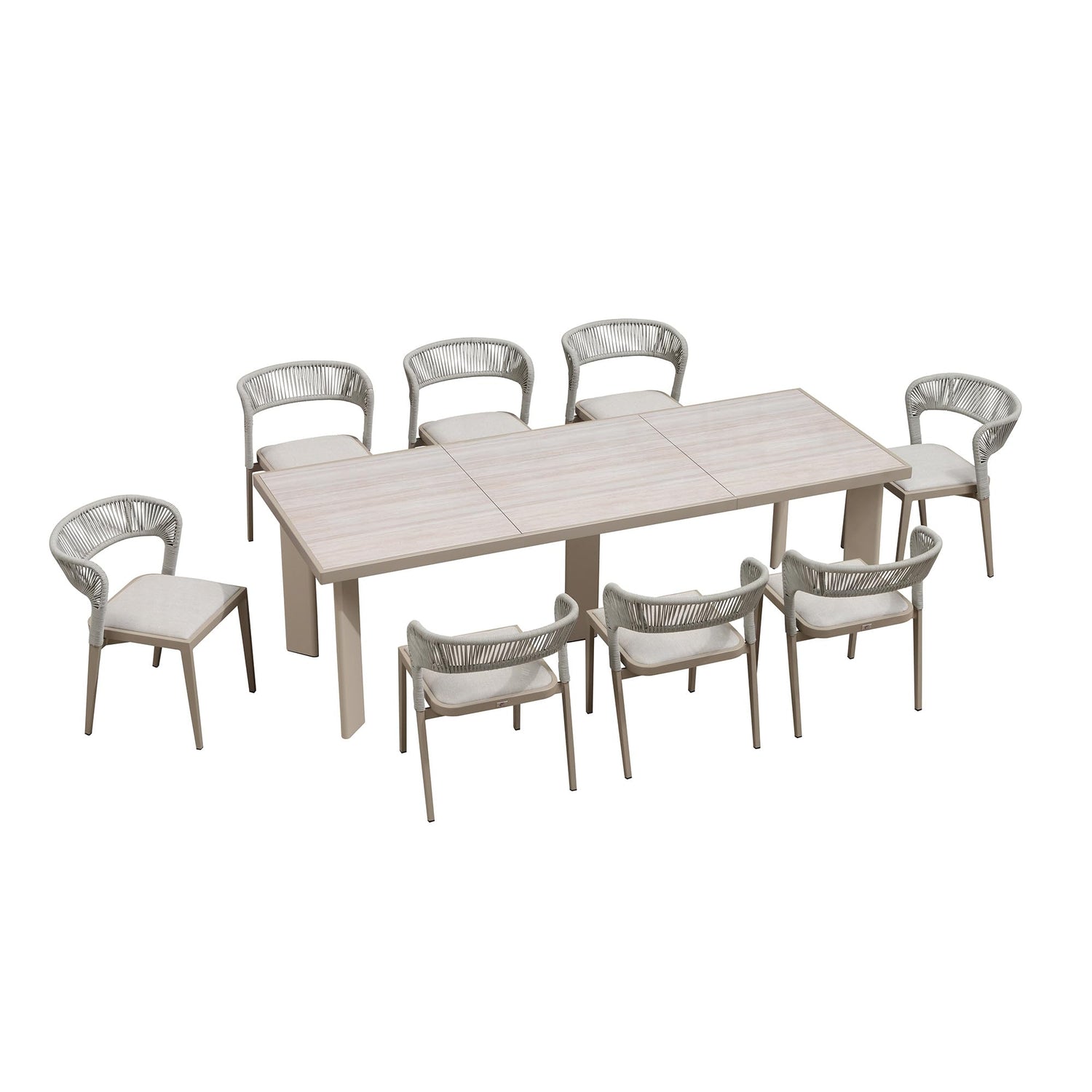 - Dining Set Dimensions: This outdoor dining table and chairs set includes 8 dining chairs and 1 rectangle table. Table size: 98.43"L x 34.25"W x 29.92"H. Chair size: 24.02"D x 22.44"W x 29.92"H. Chair capacity: 270lbs.