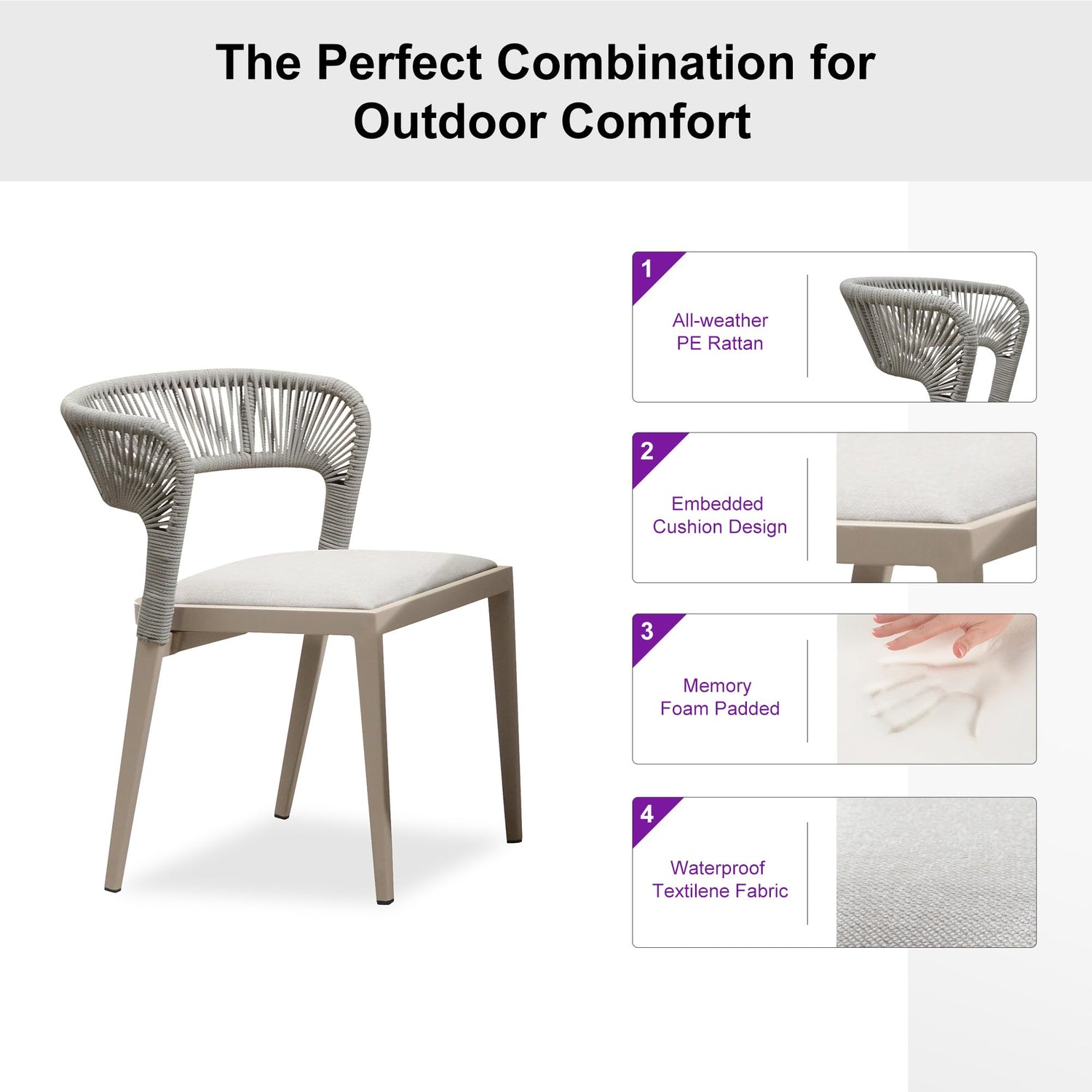 - Embedded Cushion: The embedded design prevents the cushion from slipping, featuring breathable textilene fabric and memory foam padding for long-lasting comfort.