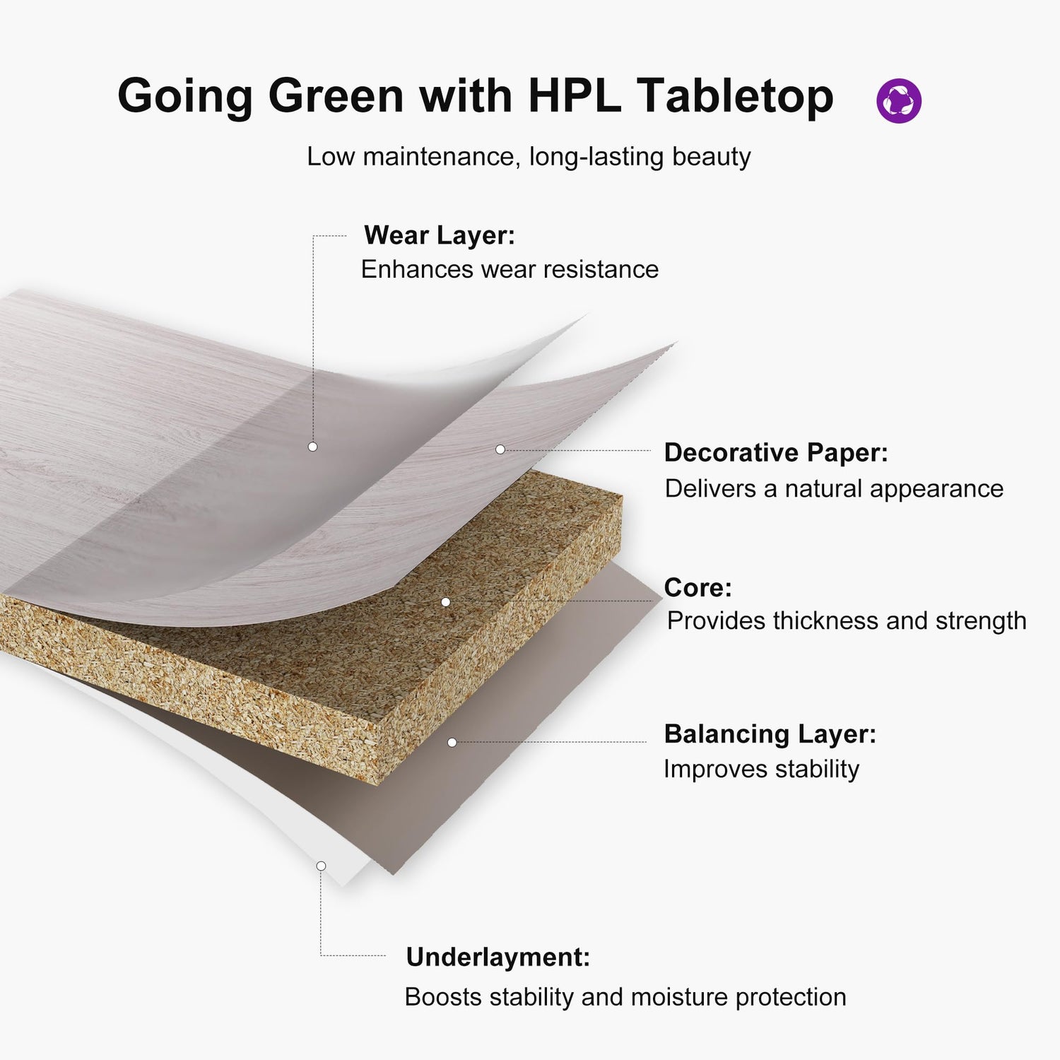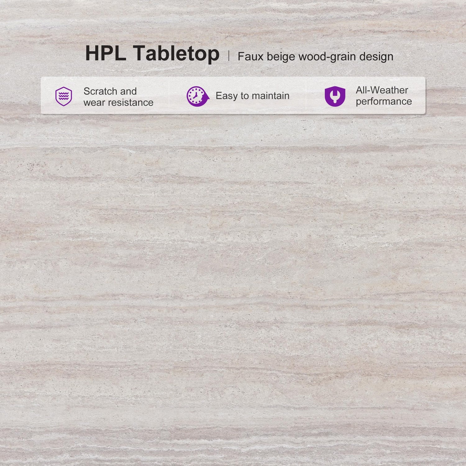- Unique HPL Tabletop: Made from sustainable High Pressure Laminate material with a faux beige wood-grain design, free from any paint. Fade-proof and waterproof for long-term outdoor use.