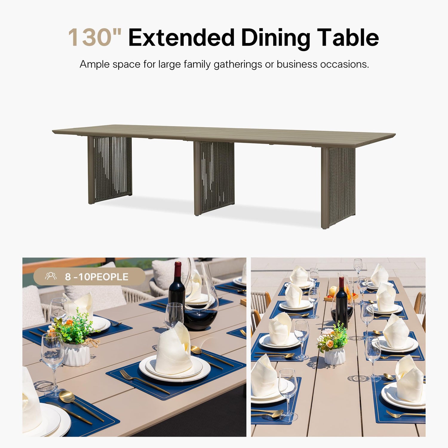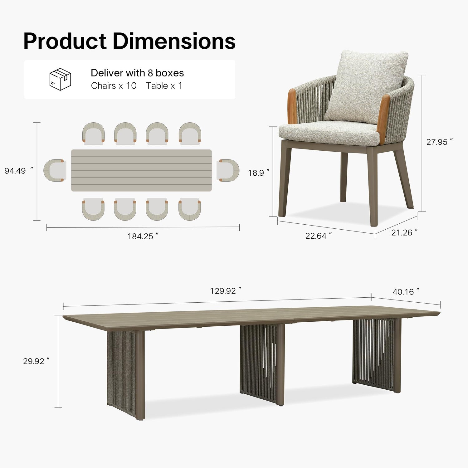• Complete 11-Piece Set: Includes 1 dining table (129.92"L x 40.16"W x 29.92"H) and 10 chairs (22.64"W x 21.26"D x 27.95"H), ideal for family and friends gatherings.