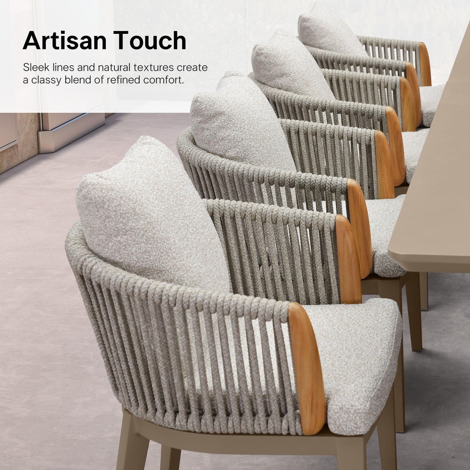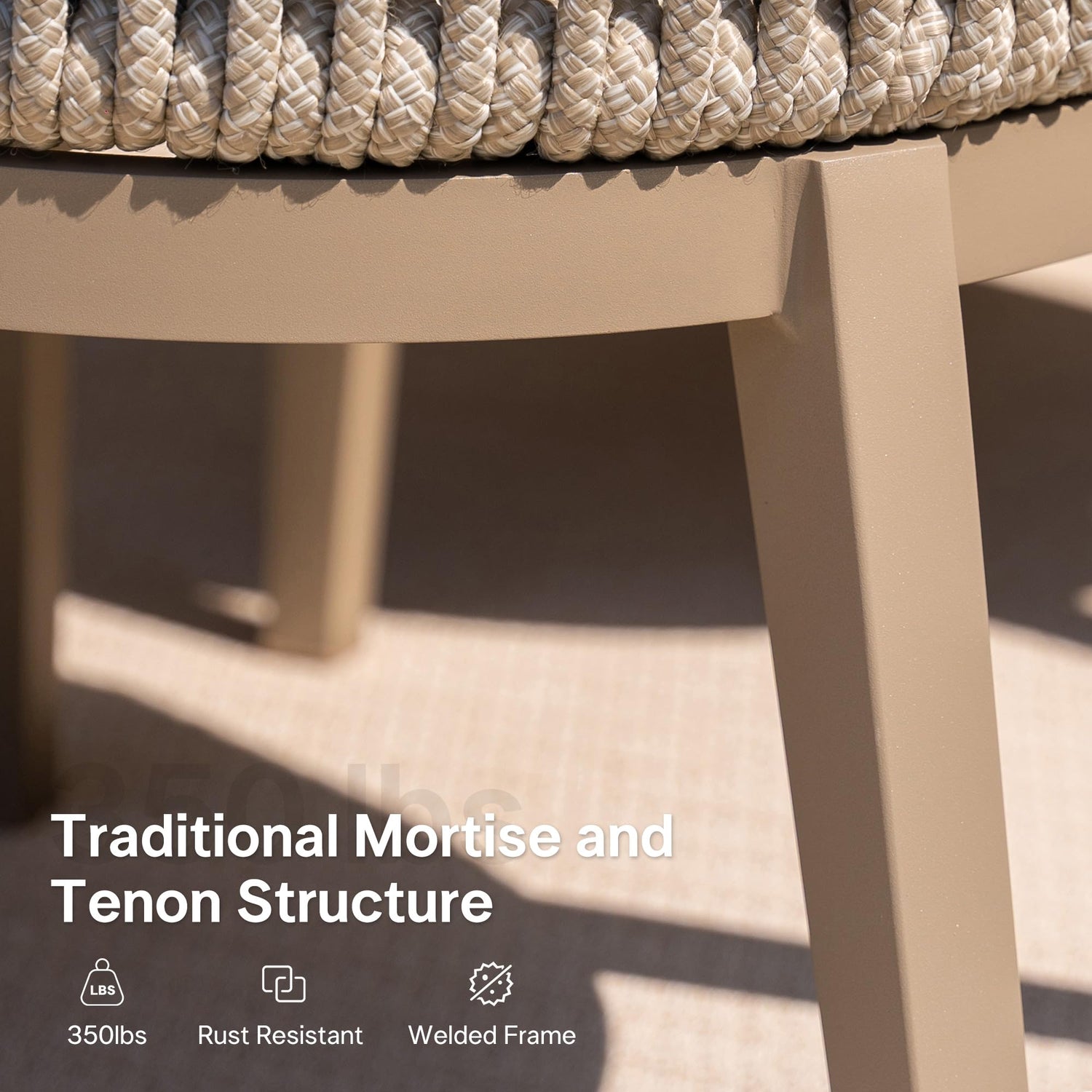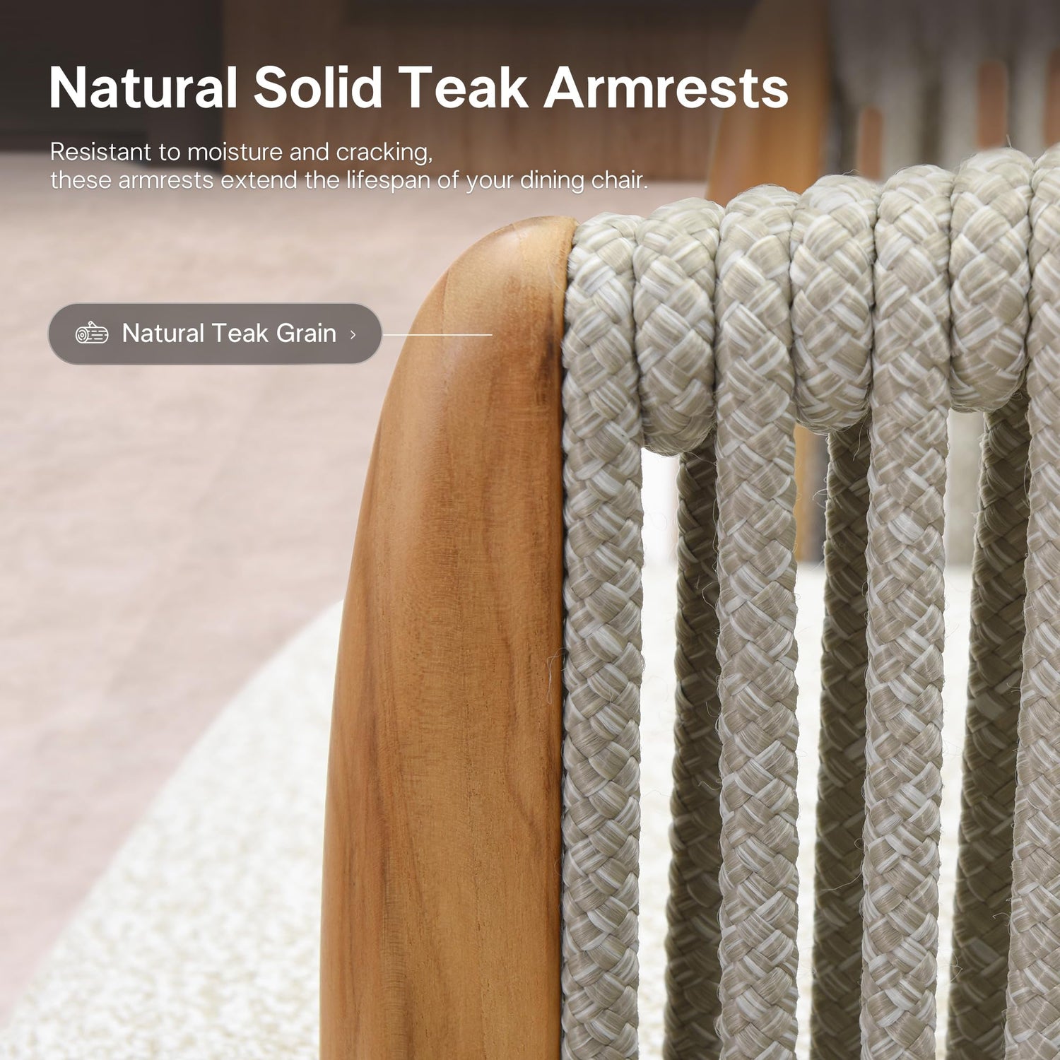 • Teak & Rope Accents: The outdoor dining chair features durable hand-woven 0.6" thickened rope backrests and smooth teak wood armrests that add natural elegance and strong support.