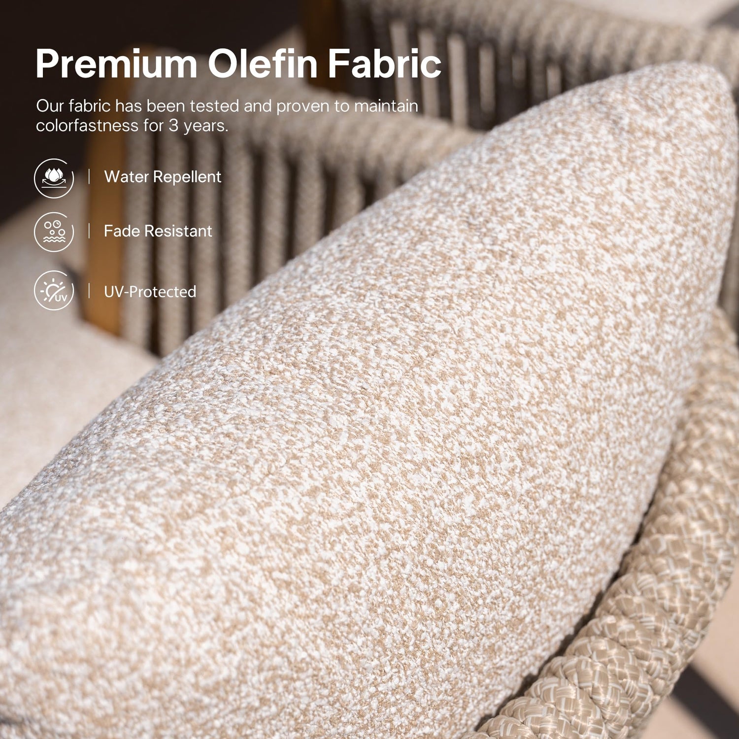 • Olefin Cushions & Pillows: This patio dining set includes plush seat cushions and lumbar pillows made from premium 100% Olefin fabric, offering excellent 7-Grades fade resistance, water repellency, and lasting comfort.