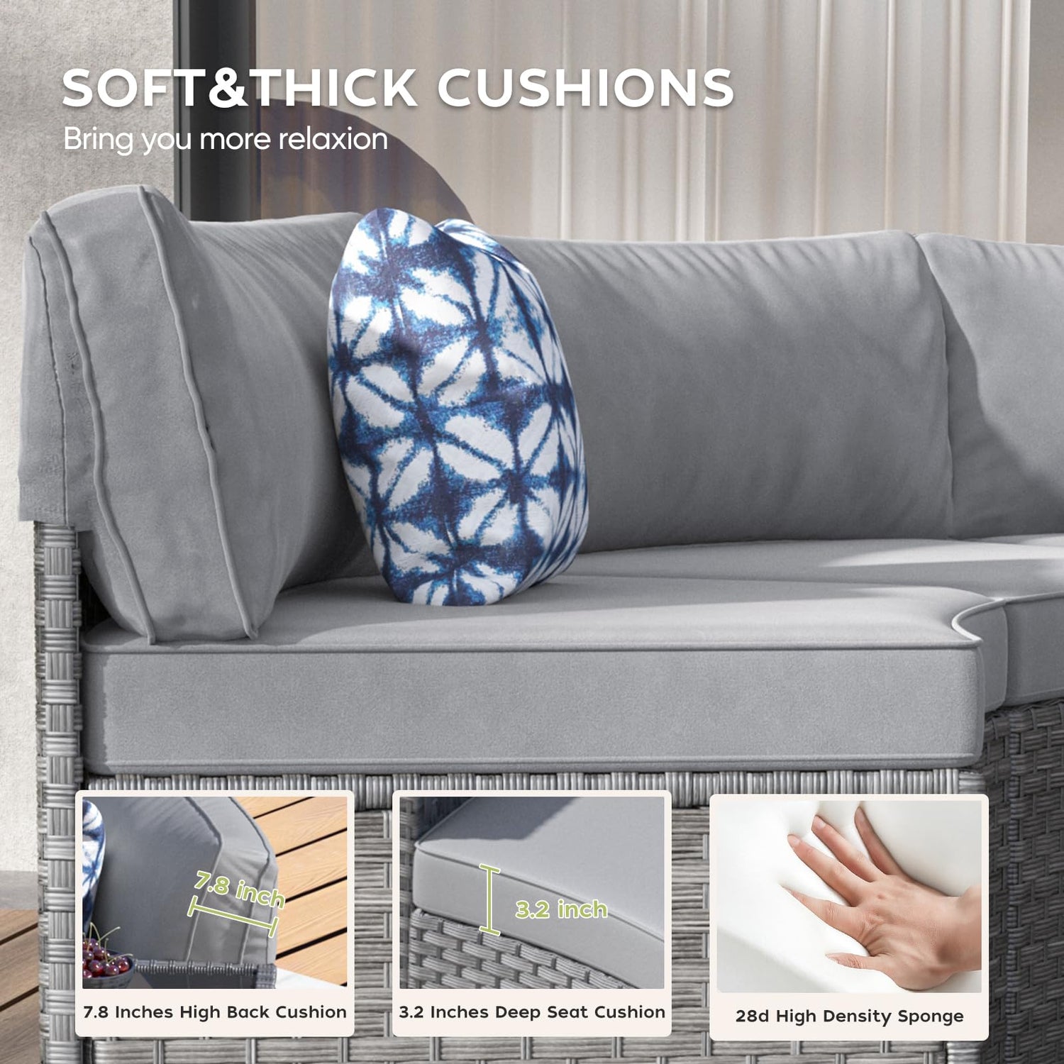 Details: Outdoor Patio Furniture Set, Grey Rattan Half-Moon Sectional Round Set, Wicker Curved Conversation Set, Curved Sofa with Tempered Glass Coffee Table