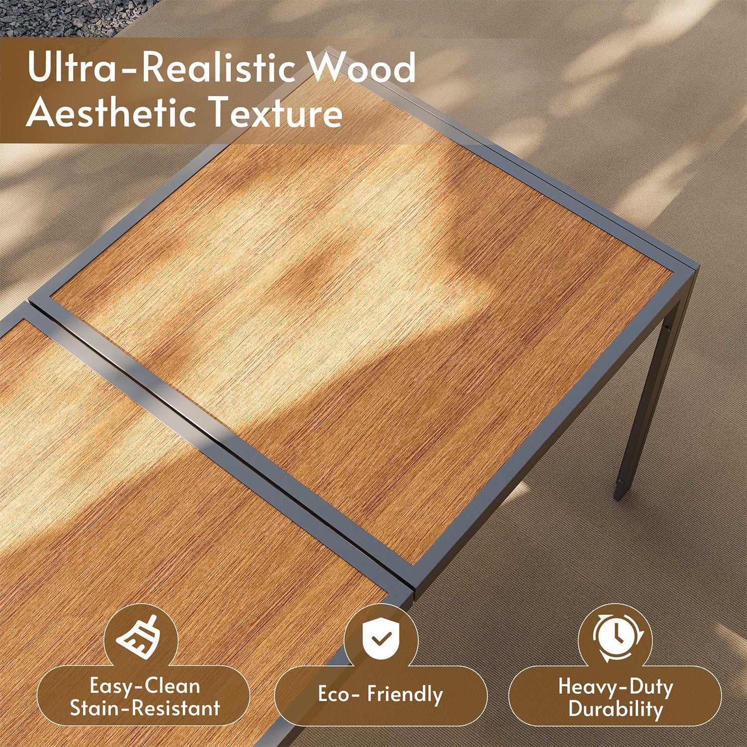 • Beautiful Wood Look, Zero Maintenance: The outdoor table and chairs feature a premium wood-grain finish that resists weather damage while staying effortlessly clean. No sealing or special care needed - just timeless backyard elegance