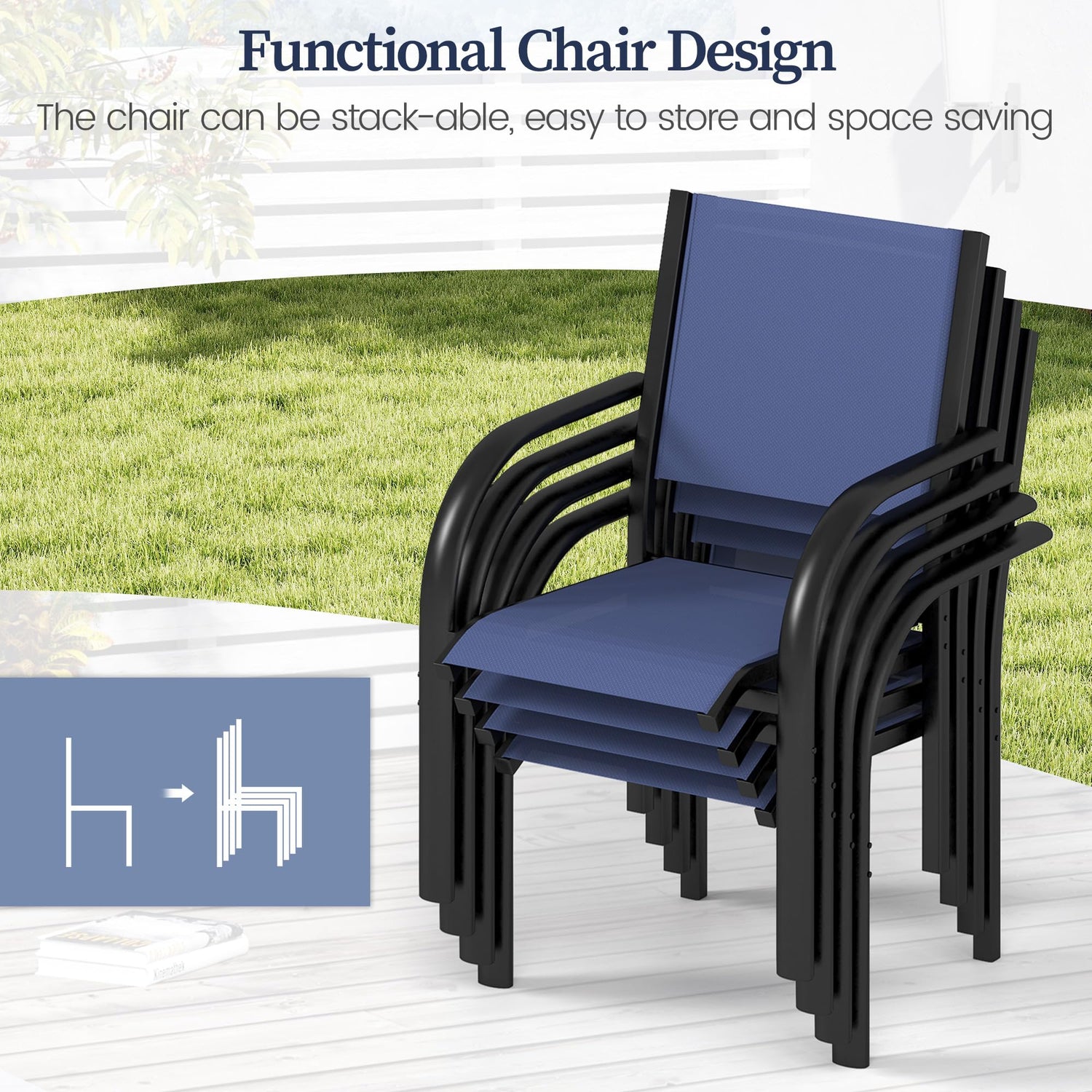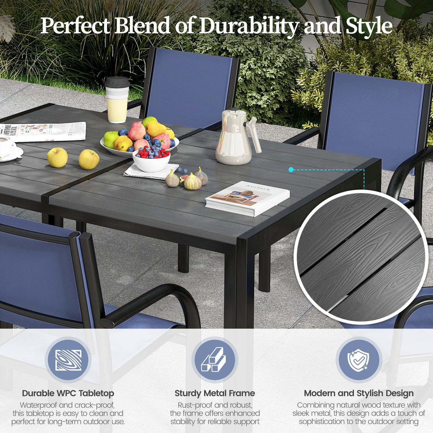- Spacious & Relaxing Tabletop:Designed with a slatted wood-like surface, the outdoor dining table provides ample space for meals, drinks, and leisure activities. The plank gaps facilitate quick water drainage, making maintenance effortless, while the natural grain finish enhances the aesthetic appeal