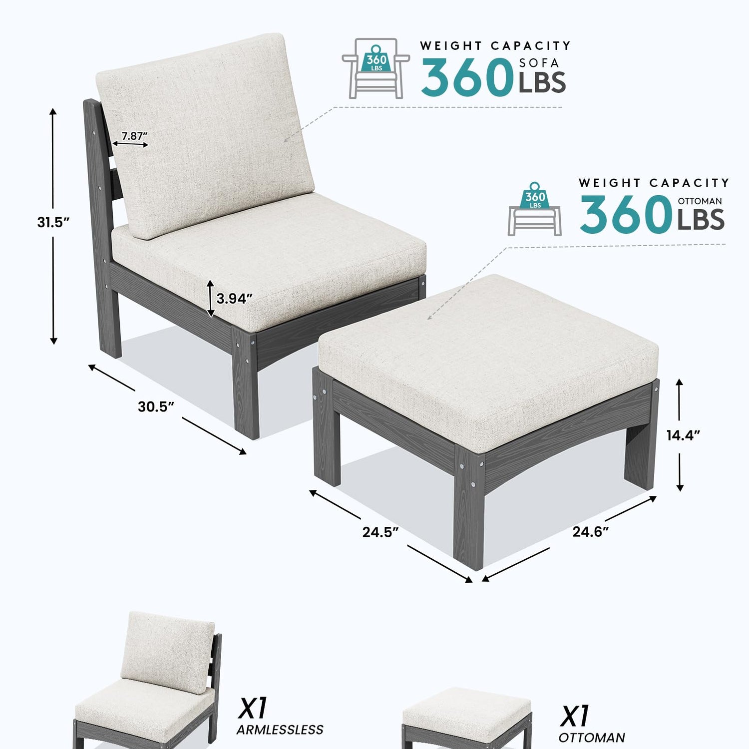- Generous Dimensions & Weight Capacity: The single armrest chair measures 24.6"L x 30.5"W x 31.5"H and ottoman 24.5"L x 24.6"W x 14.4"H. Each seat in this patio conversation set supports up to 360 lbs, making it reliable and comfortable for daily outdoor lounging