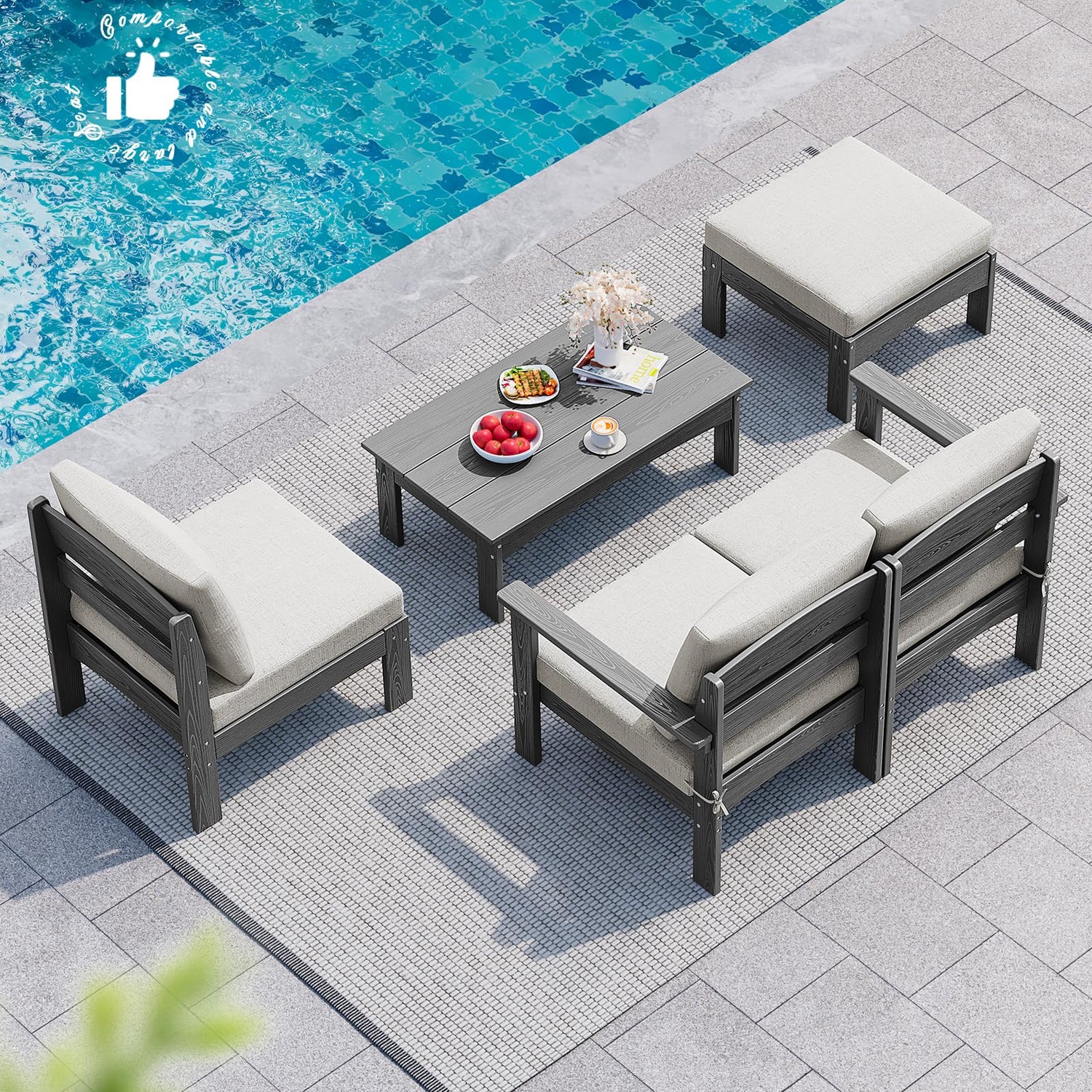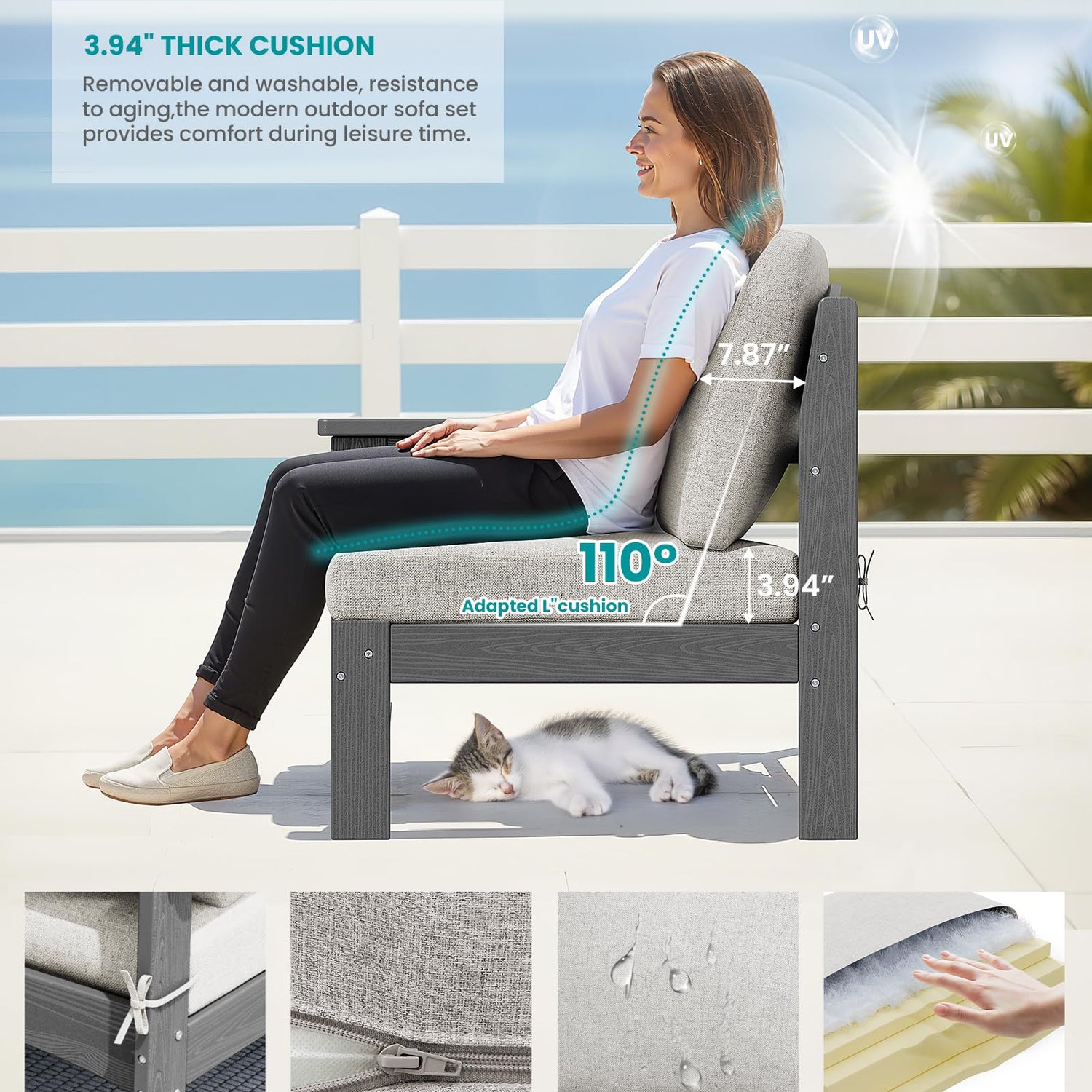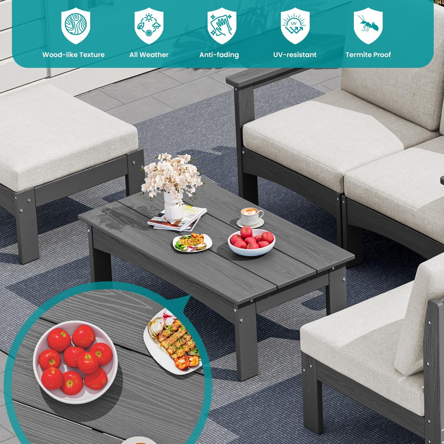 - All-Weather HDPE Material: Crafted from premium HDPE, this patio conversation set withstands the elements better than wicker, wood, or metal. It resists UV fading, cracking, rust, and water damage, keeping your outdoor sectional sofa and table looking fresh with minimal upkeep