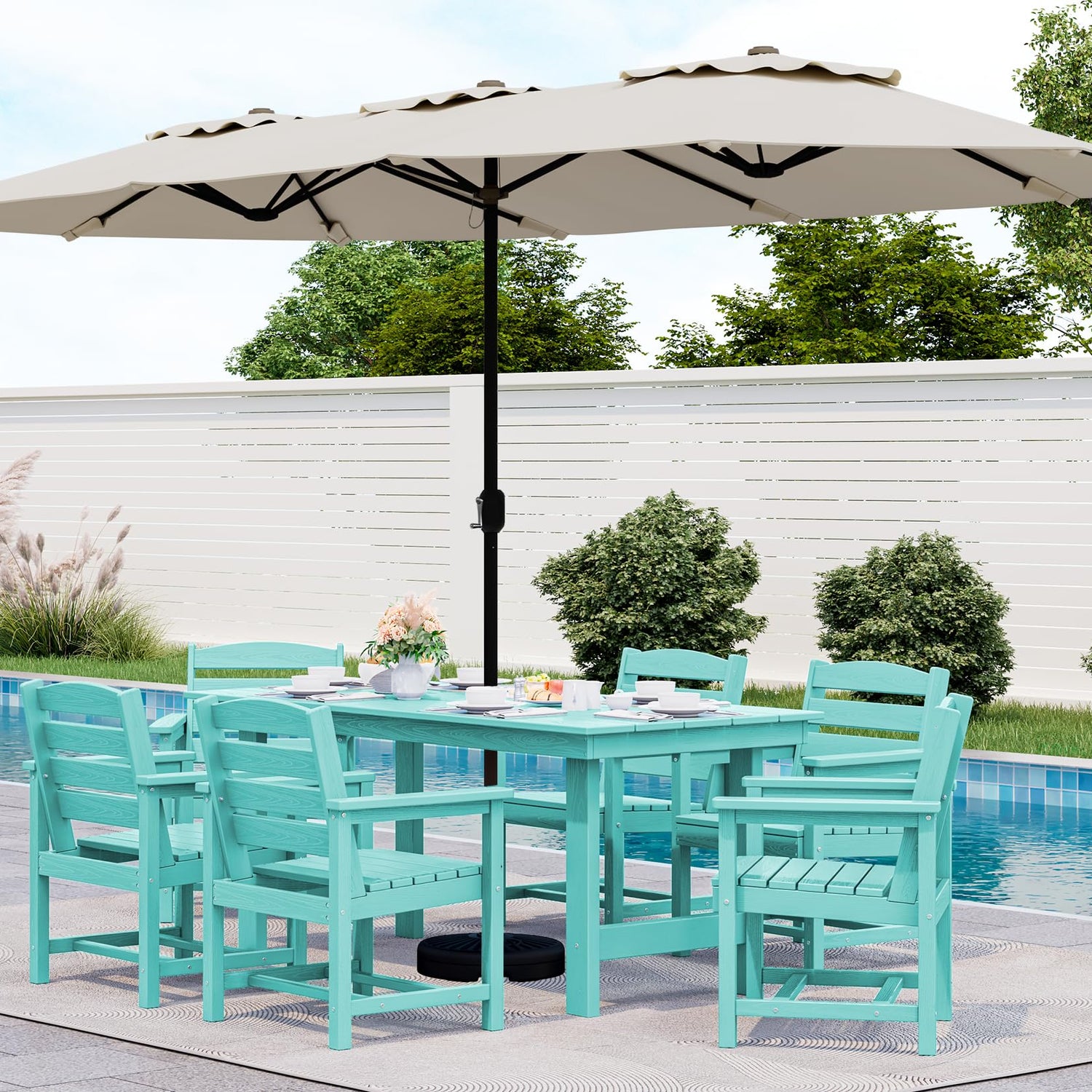 SERWALL 8-Piece Patio Dining Sets with 15FT Double Side Patio Umbrella, Outdoor HDPE Dining Furniture Set with Umbrella Hole Cut-Out Table and 6 Chairs, Aruba(Umbreall Base not Included)