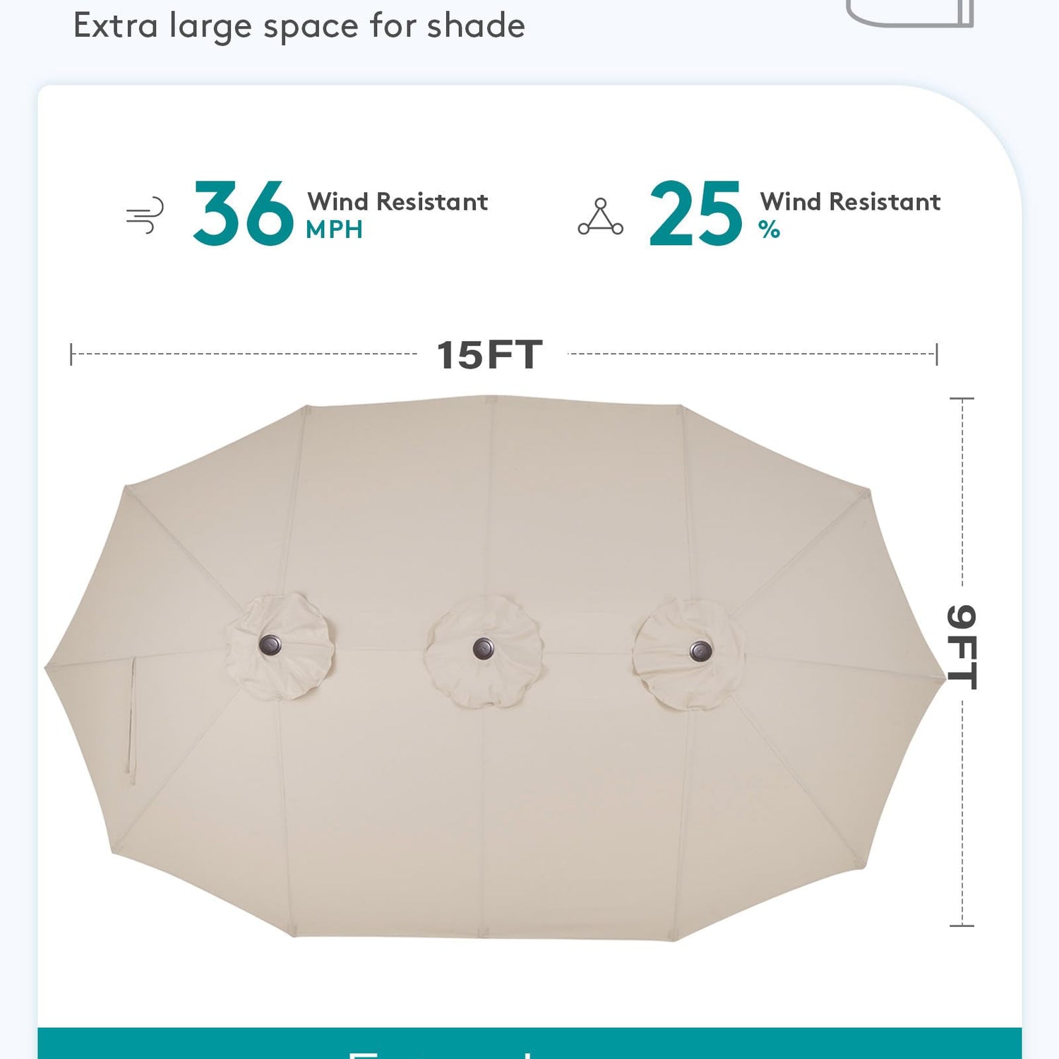 - 【15FT Double-Sided Patio Umbrella】This extra-large shade blocks sunlight effectively while its 3 top vents improve airflow, reducing heat buildup and enhancing stability in windy conditions.