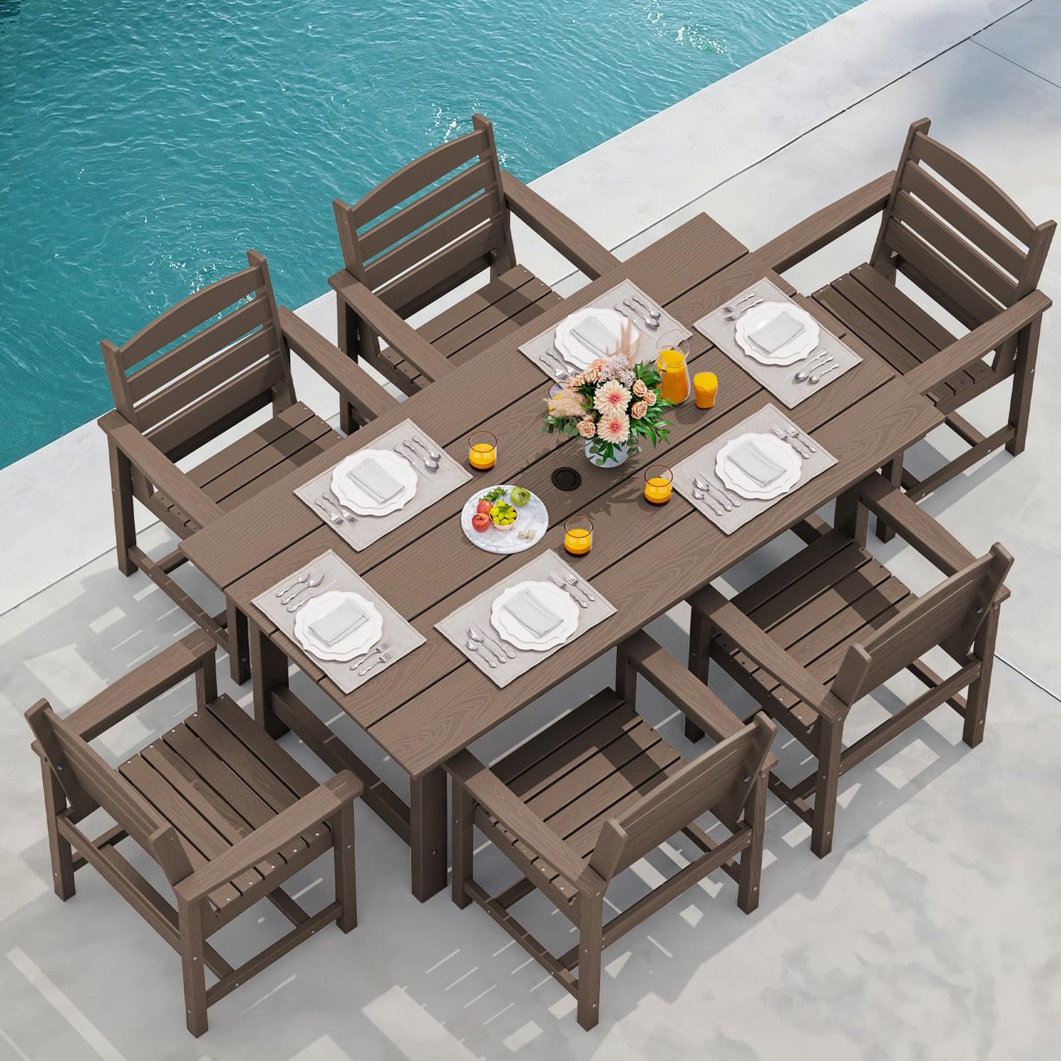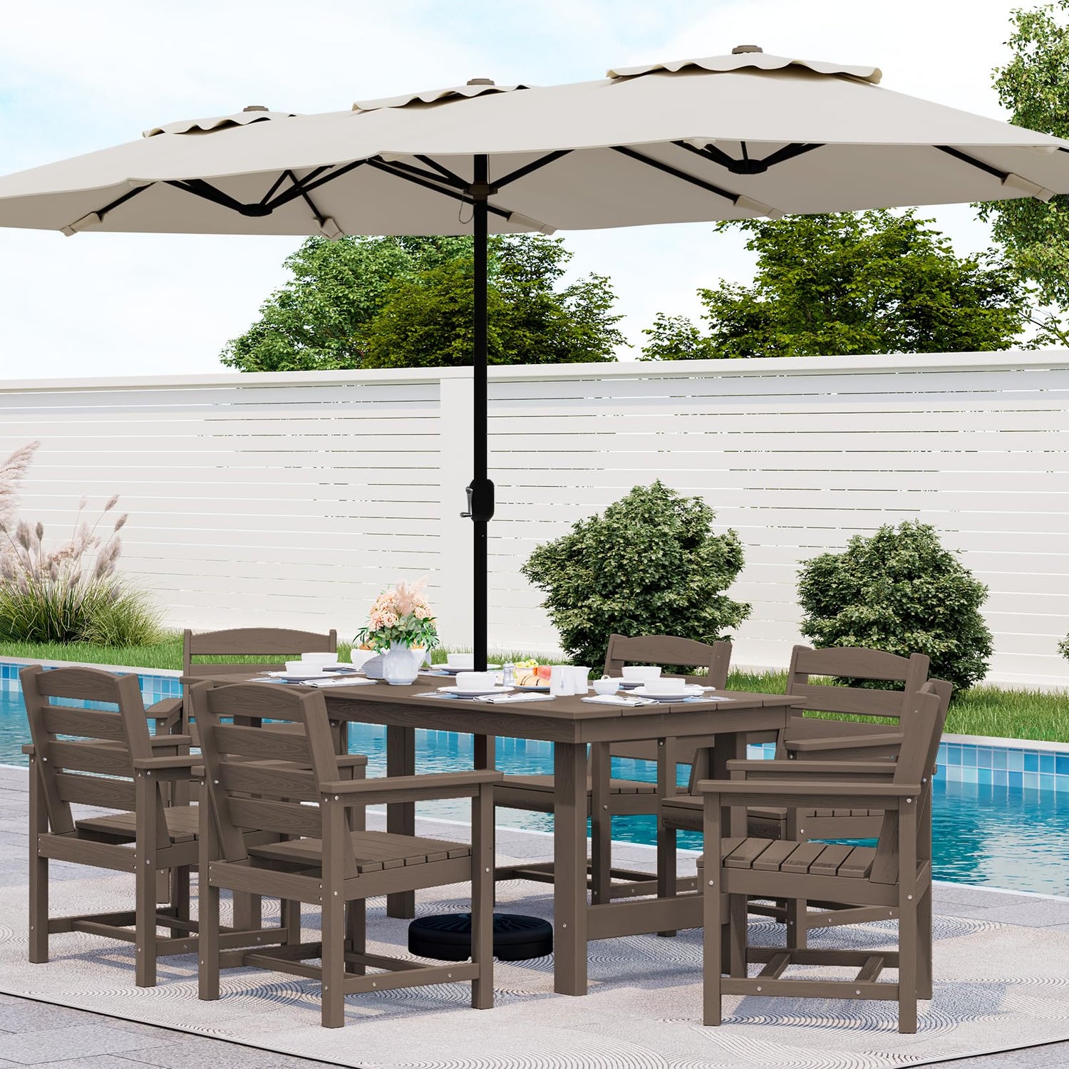 SERWALL 8-Piece Patio Dining Sets with 15FT Double Side Patio Umbrella, Outdoor HDPE Dining Furniture Set with Umbrella Hole Cut-Out Table and 6 Chairs, Coffee(Umbreall Base not Included)