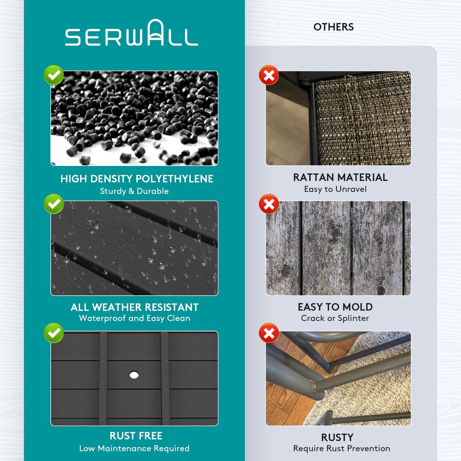 - 【All Weather Use】SERWALL patio dining sets are built to withstand the elements and provide long-lasting performance. The sturdy frames and high-density polyethylene materials ensure durability and reliability, allowing you to enjoy outdoor dining for years to come.