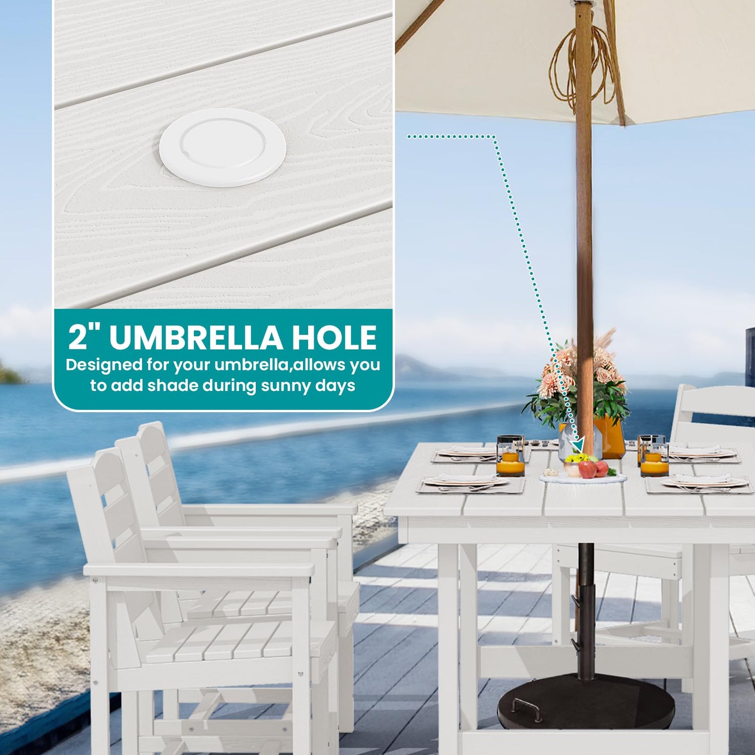 SERWALL Patio Table Set, Outdoor HDPE Dining Set with Umbrella Hole, 5-Piece - Table and 4 Chairs, All Weather for Lawn, Garden, Poolside, White