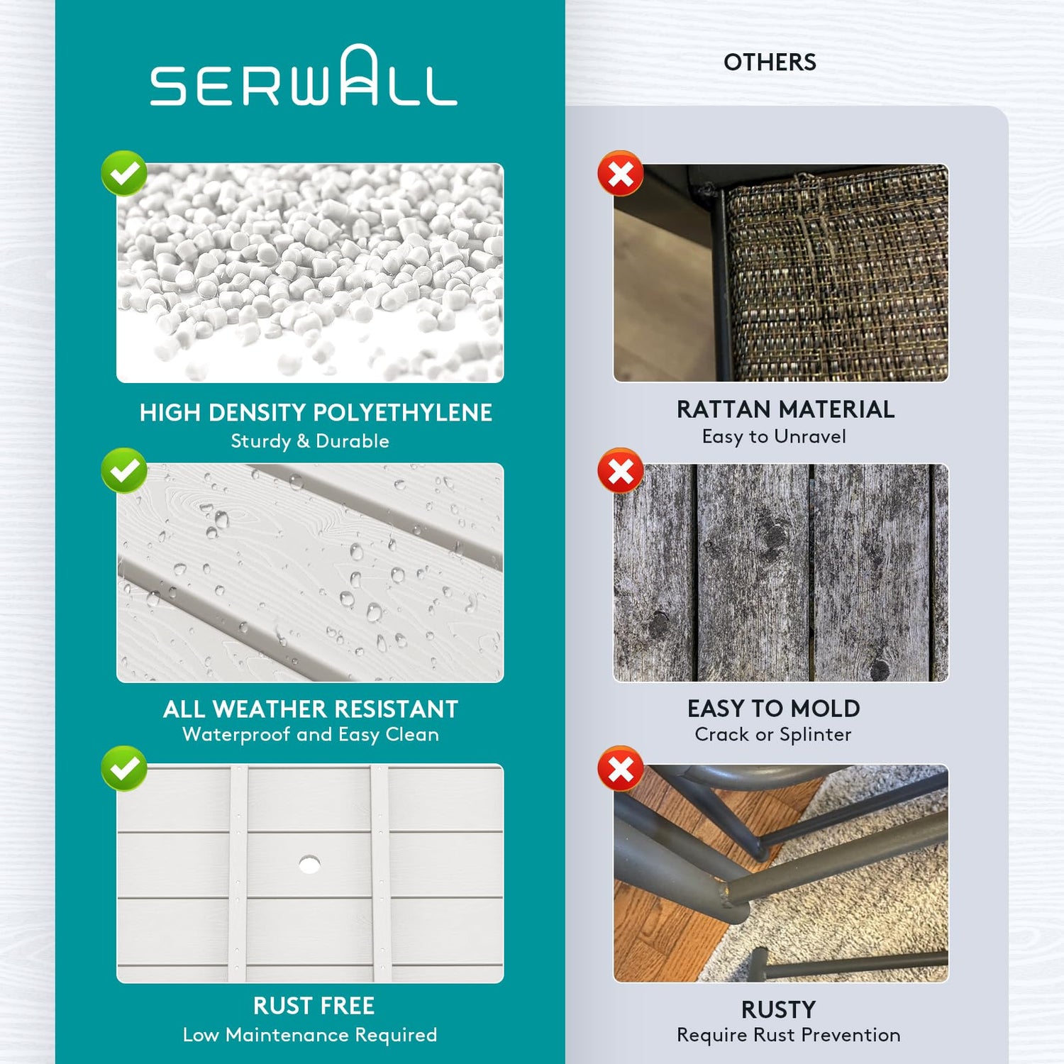 - 【All Weather Use】SERWALL patio dining sets are built to withstand the elements and provide long-lasting performance. The sturdy frames and high-density polyethylene materials ensure durability and reliability, allowing you to enjoy outdoor dining for years to come.