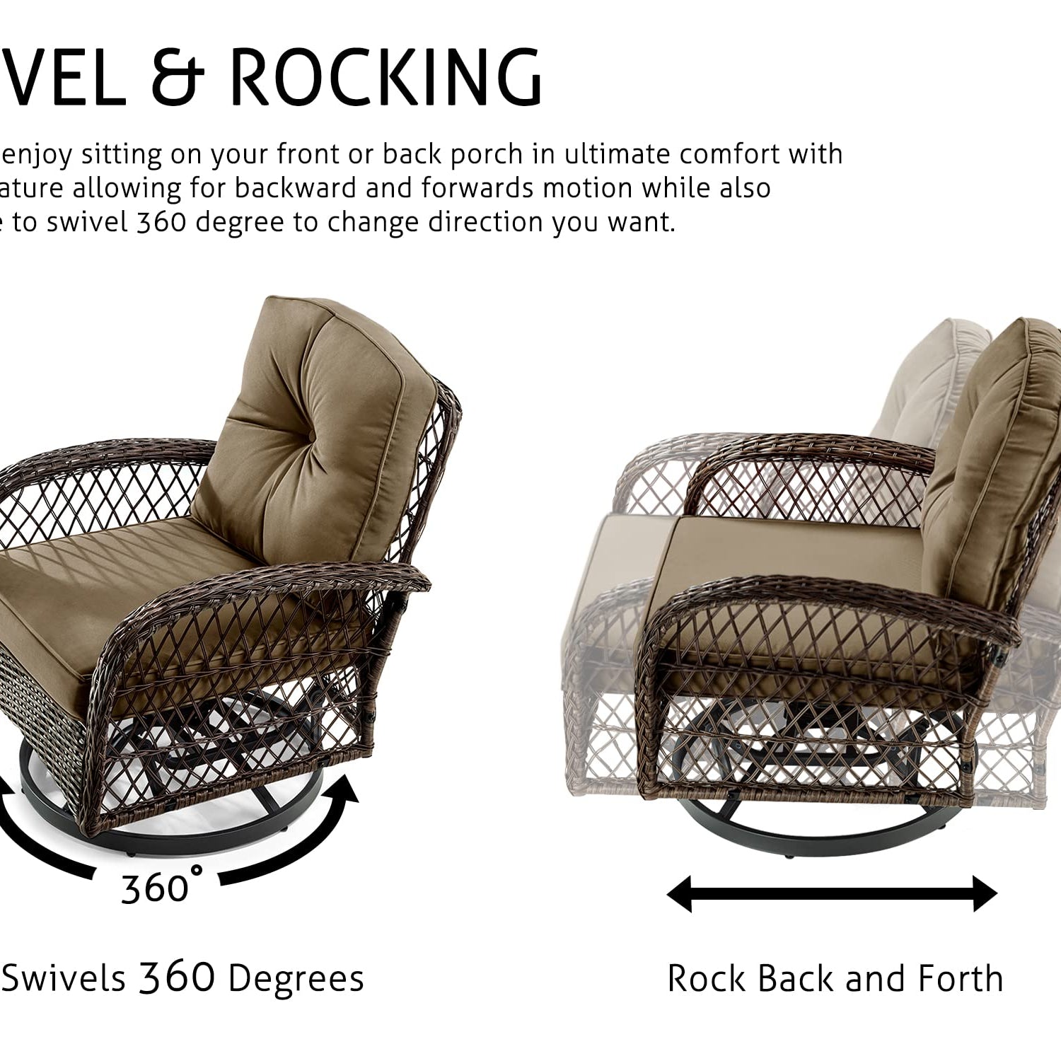 • ROCKING & 360 DEGREE SWIVEL - Full rotation patio chairs allow you to face or leave the sun easily. The unique design of swinging back and forth allows you to enjoy ultimate relaxation.