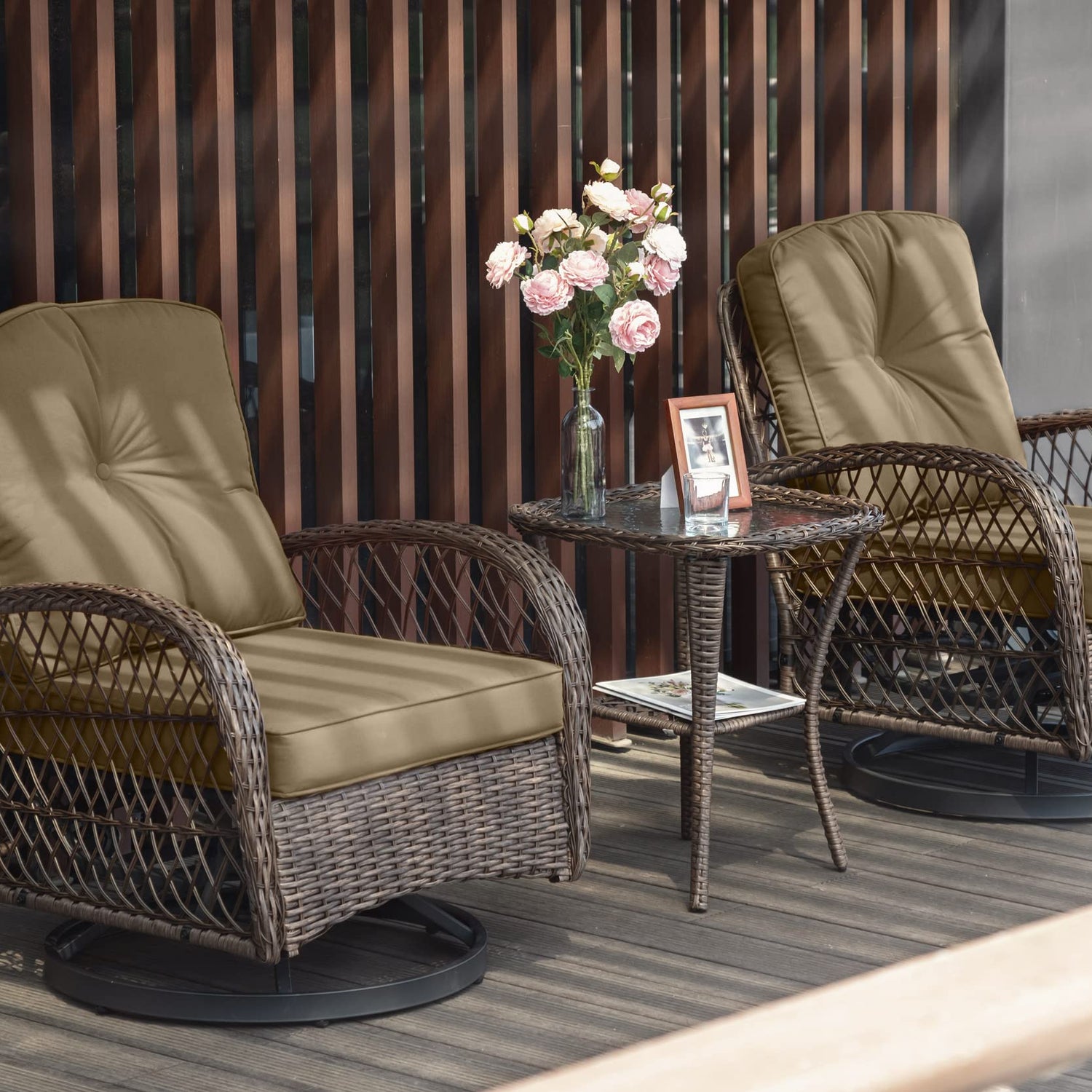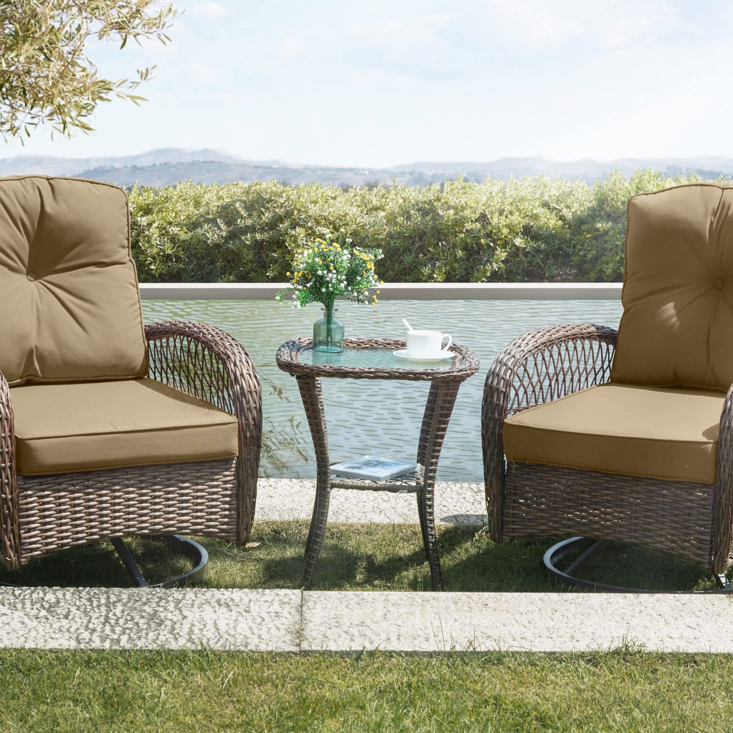 SHA CERLIN 3 Pieces Patio Furniture Set, Outdoor Swivel Glider Rocker, Wicker Patio Bistro Set with Rocking Chair, Cushions and Table (Khaki)