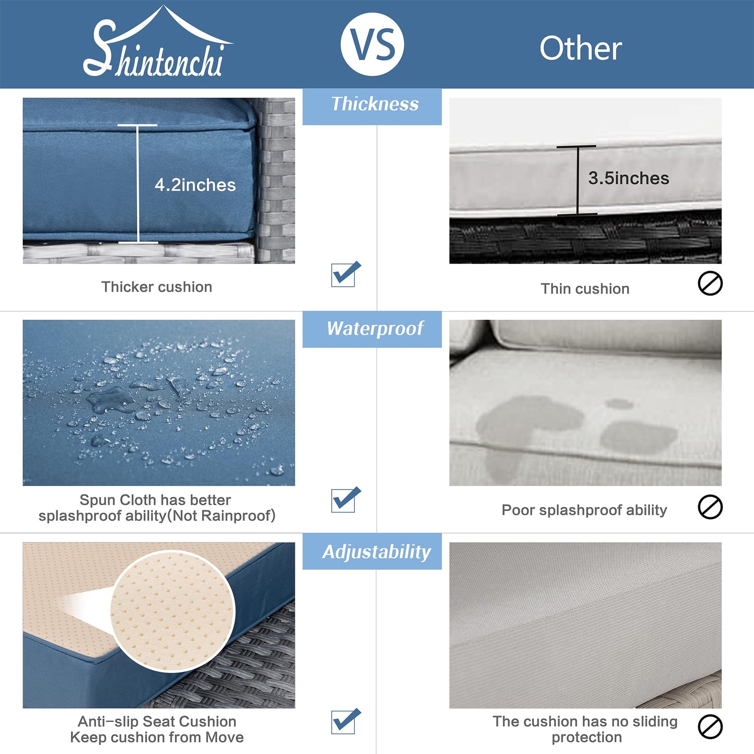 - Note: cushions are not water-proof, When you don' t use it, advise you to take cushions inside or buy a cover for longer service time.