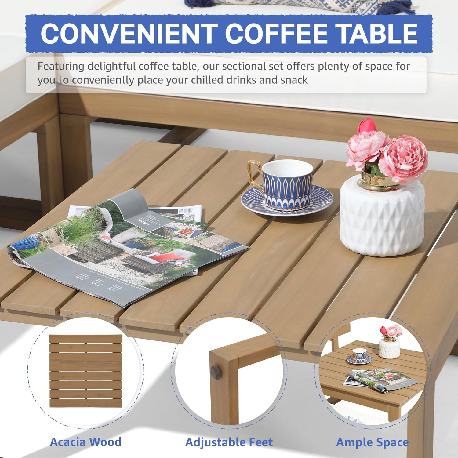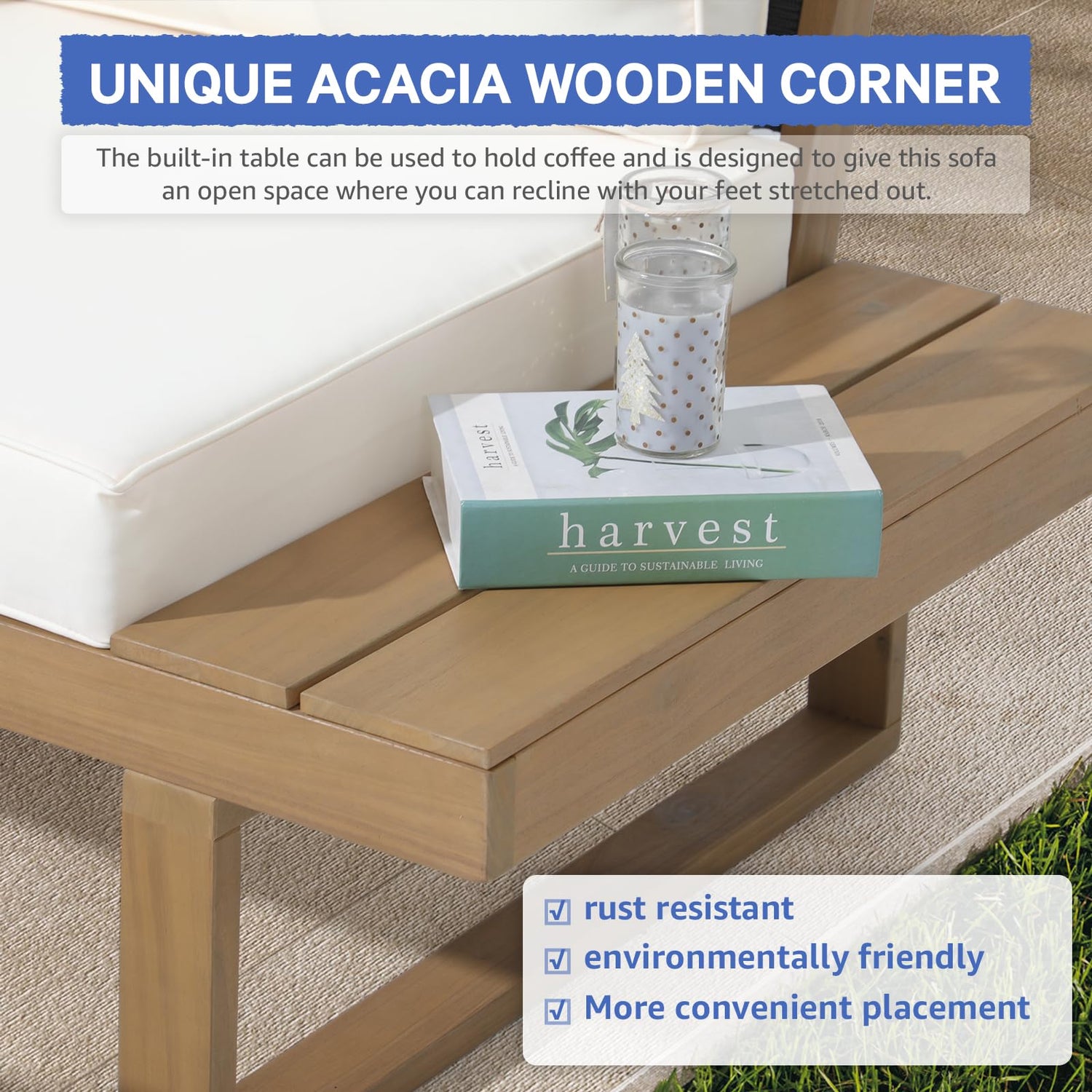 Soleil Jardin 4 Piece Acacia Wood Patio Furniture L-Shaped Outdoor Sectional Sofa Set with Coffee Table, FSC Certified Conversation Set with Built-in Side Table and Cream White Cushions for Garden