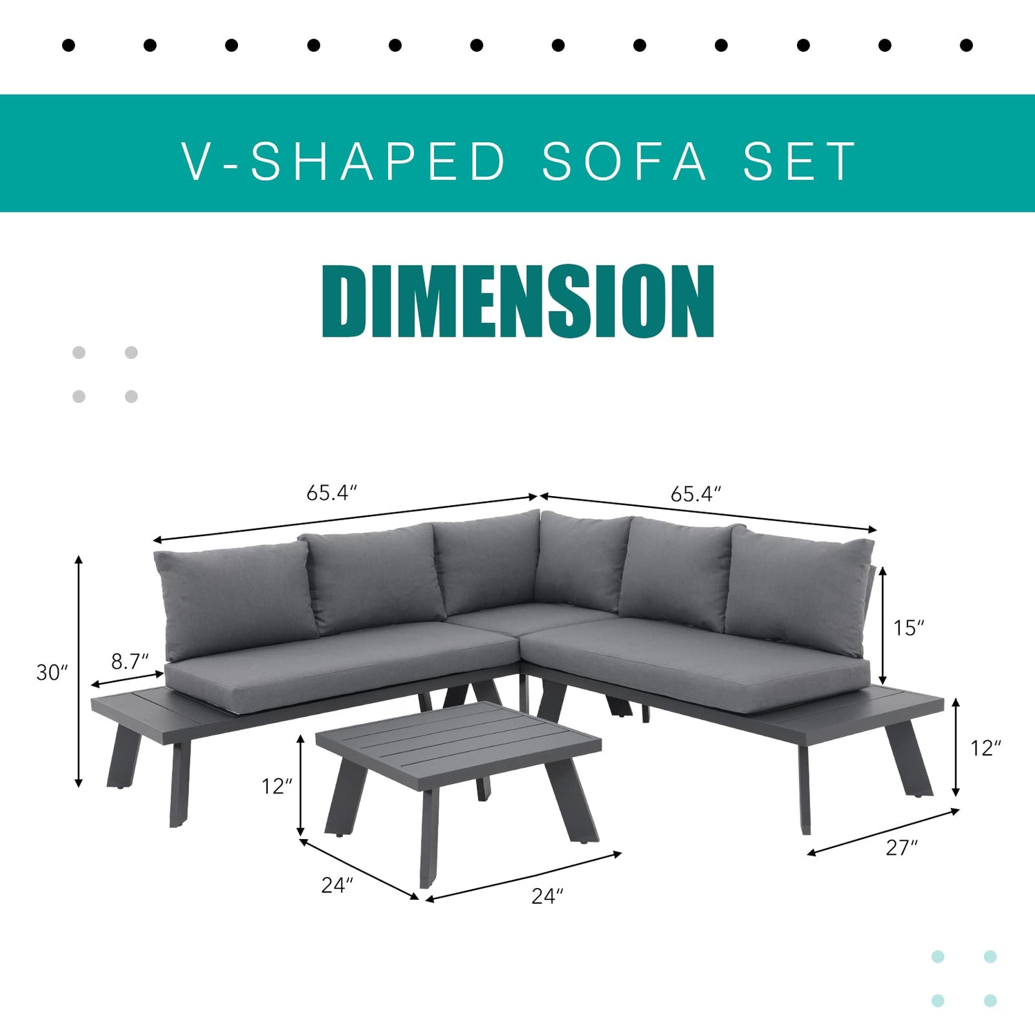 - FUNCTIONAL DETAILS - The L-shaped patio furniture offers built-in side tables at the end on each side, adding extra space to place drinks or other items. Adjustable feet at the bottom of table and chairs are used for helping with un-even surfaces to keep the furniture stability.