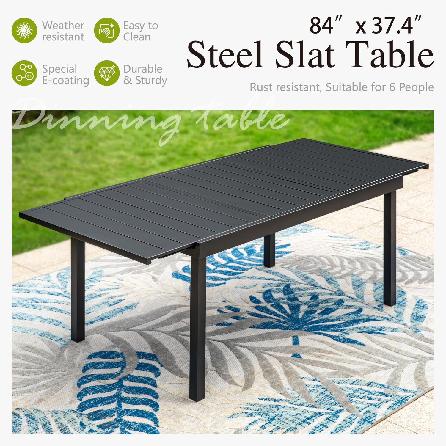 - 8-Person Outdoor Dining Table: Black iron extendable table, designed to comfortably seat 6 to 8 guests. Table Size: 62"L x 37.5"W x 30"H, Expanded: 84"L. With its classic minimalist design and rust-resistant finish, this table combines style and durability for lasting enjoyment