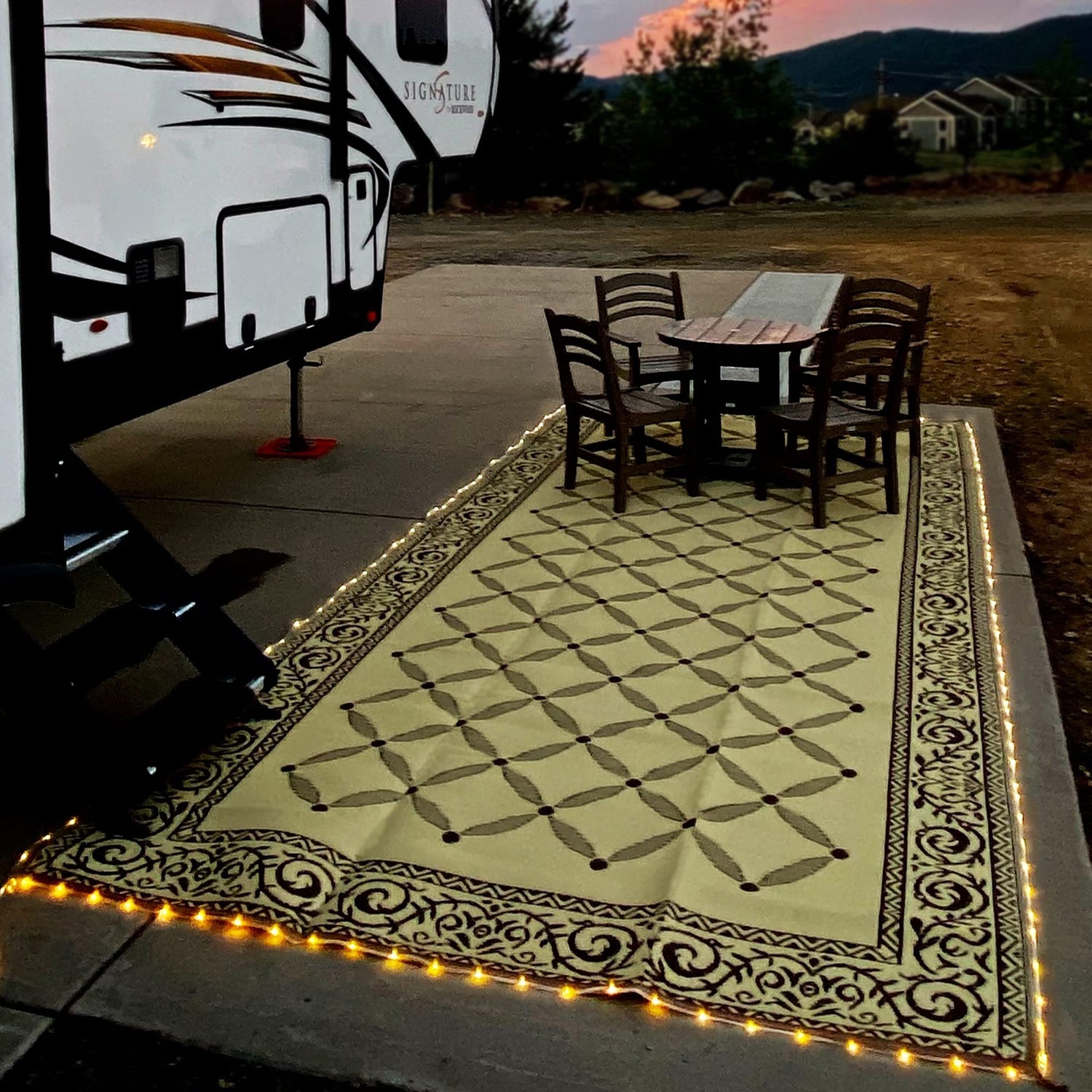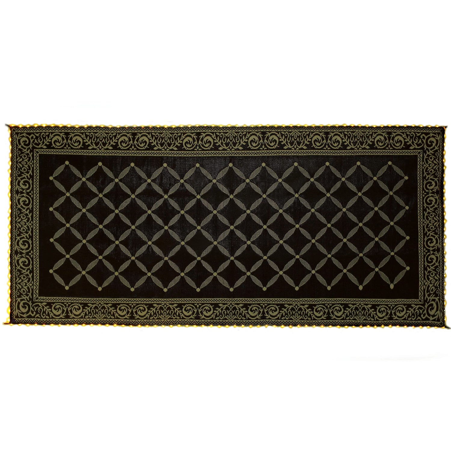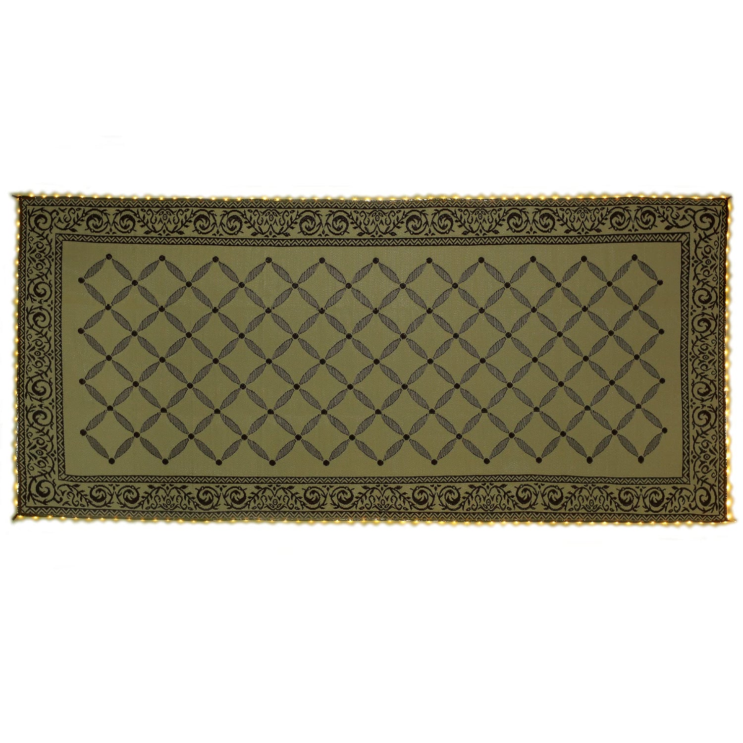 - MULTIFUNCTIONAL MAT: Use indoor or outdoor, Reversible mats are designed to be versatile whether it’s used on your patio, by the pool, picnics, or your laundry room. With its lightweight and foldable features, these mats are easy to move around furniture and transport. Plug into an outlet and light your patio with the border LED lighting.Construction type:Machine Made