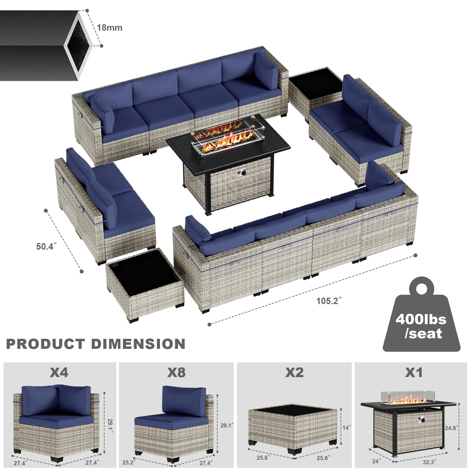 Sweecci 15-Piece Patio Furniture Set, Outdoor Patio Furniture with 55,000 BTU Fire Pit Table, Thick Cushions, Modular Patio Sofa, Dual-Strand Wicker Rattan, Rust-Resistant Frame, Navy Blue