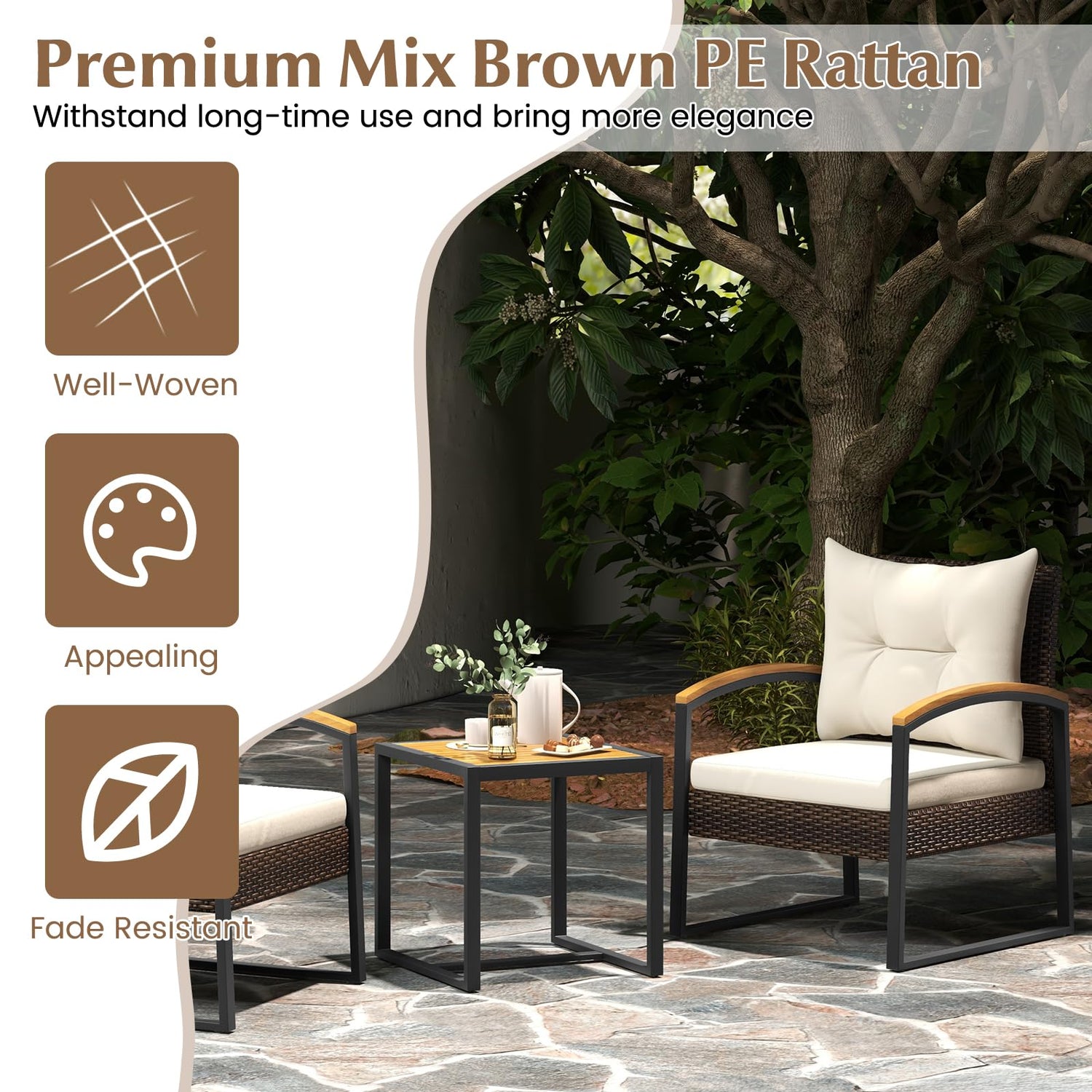 Tangkula 3 Piece Patio Conversation Set, Includes 2 Rattan Chairs and Coffee Table, Solid Acacia Wood Armrests & Tabletop, Outdoor Cushioned Wicker Furniture Set for Backyard, Poolside, Lawn, Garden