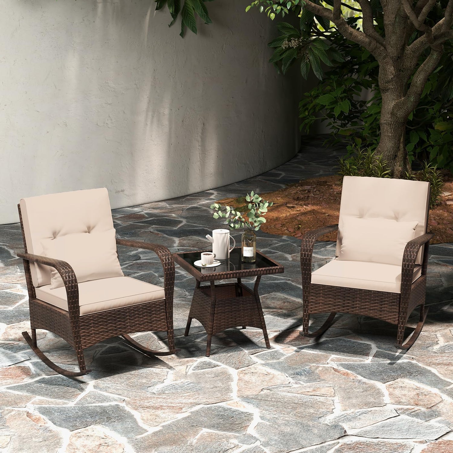 • Convenient Coffee Table: Complete with a matching coffee table, this 3-piece rocking bistro set is perfect for holding drinks, books, or decorations. The tempered glass tabletop is secured with 4 premium suction cups, combining convenience with elegance.