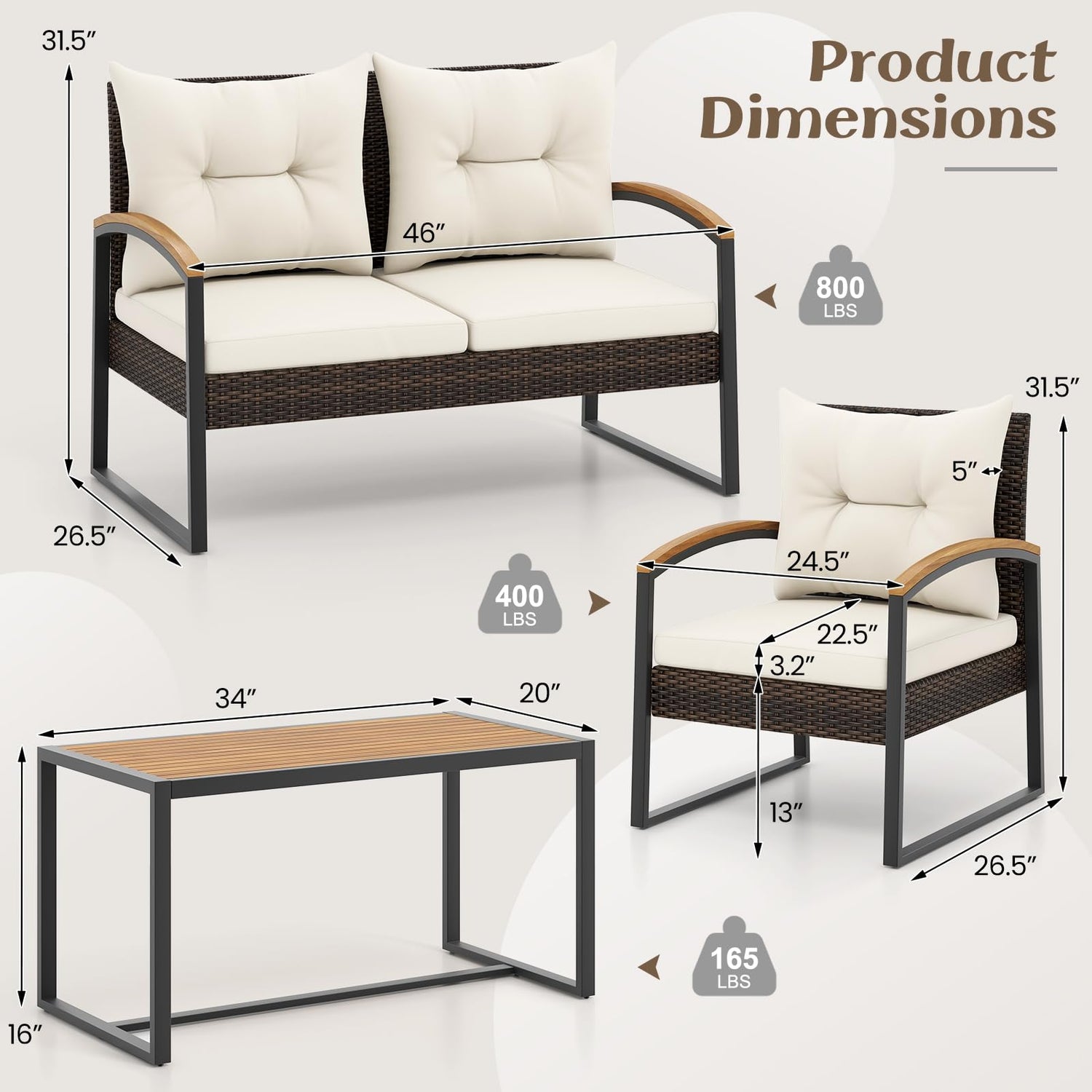• Versatile Outdoor Addition: This 4 piece wicker furniture set is an exquisite addition to any backyard or poolside setting, perfect for creating a welcoming outdoor space. Dimension of chair: 26.5” x 24.5” x 31.5” (L x W x H). Dimension of coffee table: 18” x 18” x 16” (L x W x H). Dimension of loveseat: 26.5” x 46” x 31.5” (L x W x H).