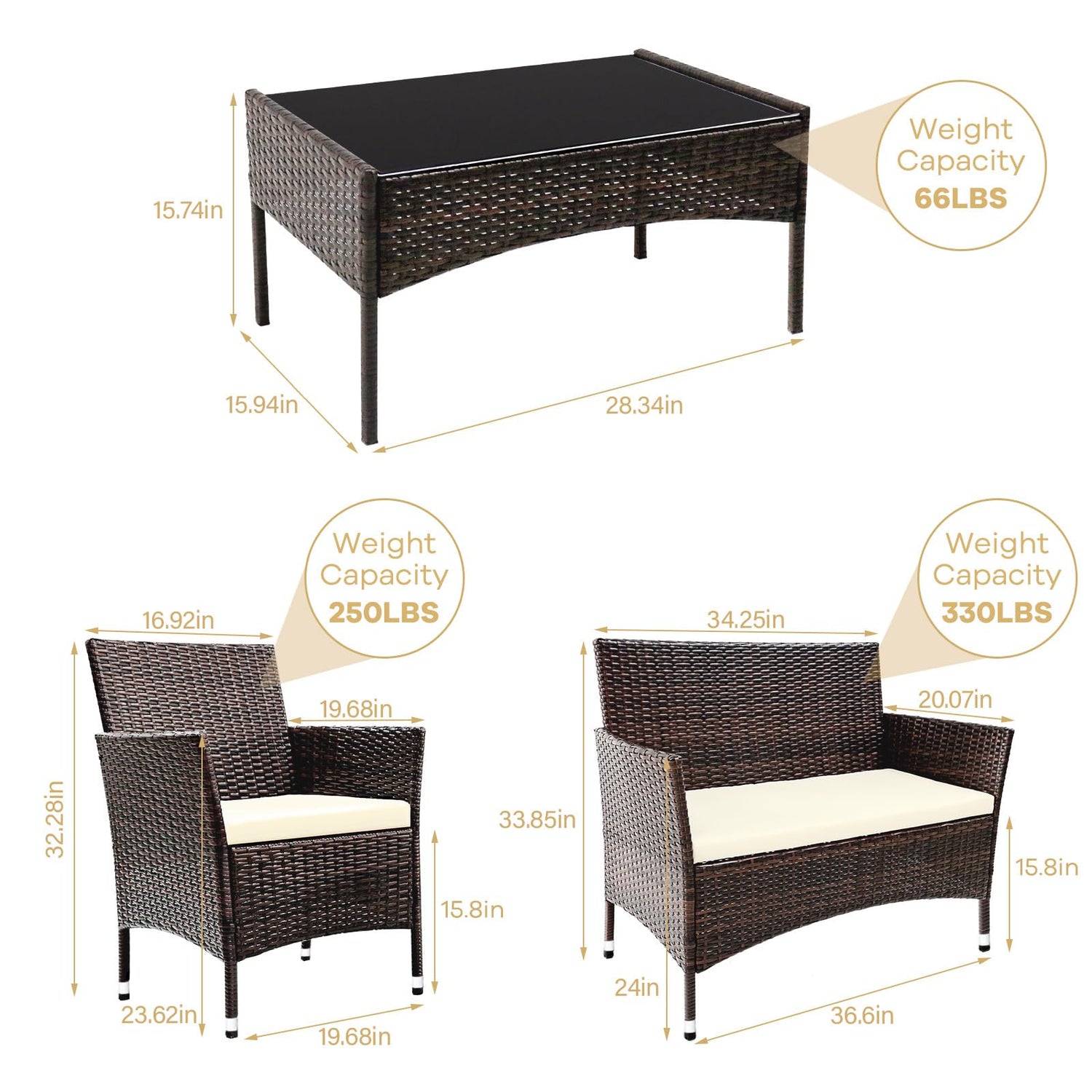 Details: Outdoor Patio Furniture Sets, 4 Pieces Wicker Patio Conversation Sets with Tempered Glass Table, Cushion, for Yard, Garden, Poolside, Porch, Bistro, Balcony