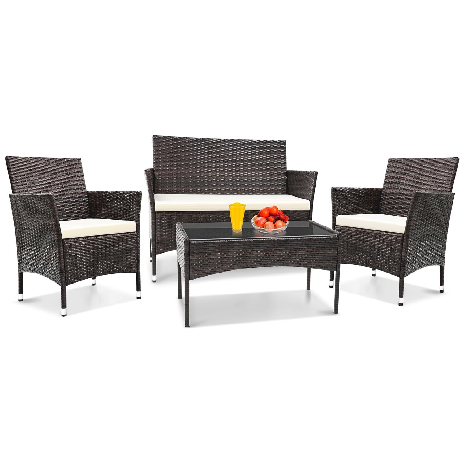 - Spruce up your outdoor living space with this 4 pieces patio furniture set, offering casual comfort for relaxing or entertaining. Perfect for a comfortable chat or casual drinks, this set includes a coffee table, a loveseat and two single chairs.
