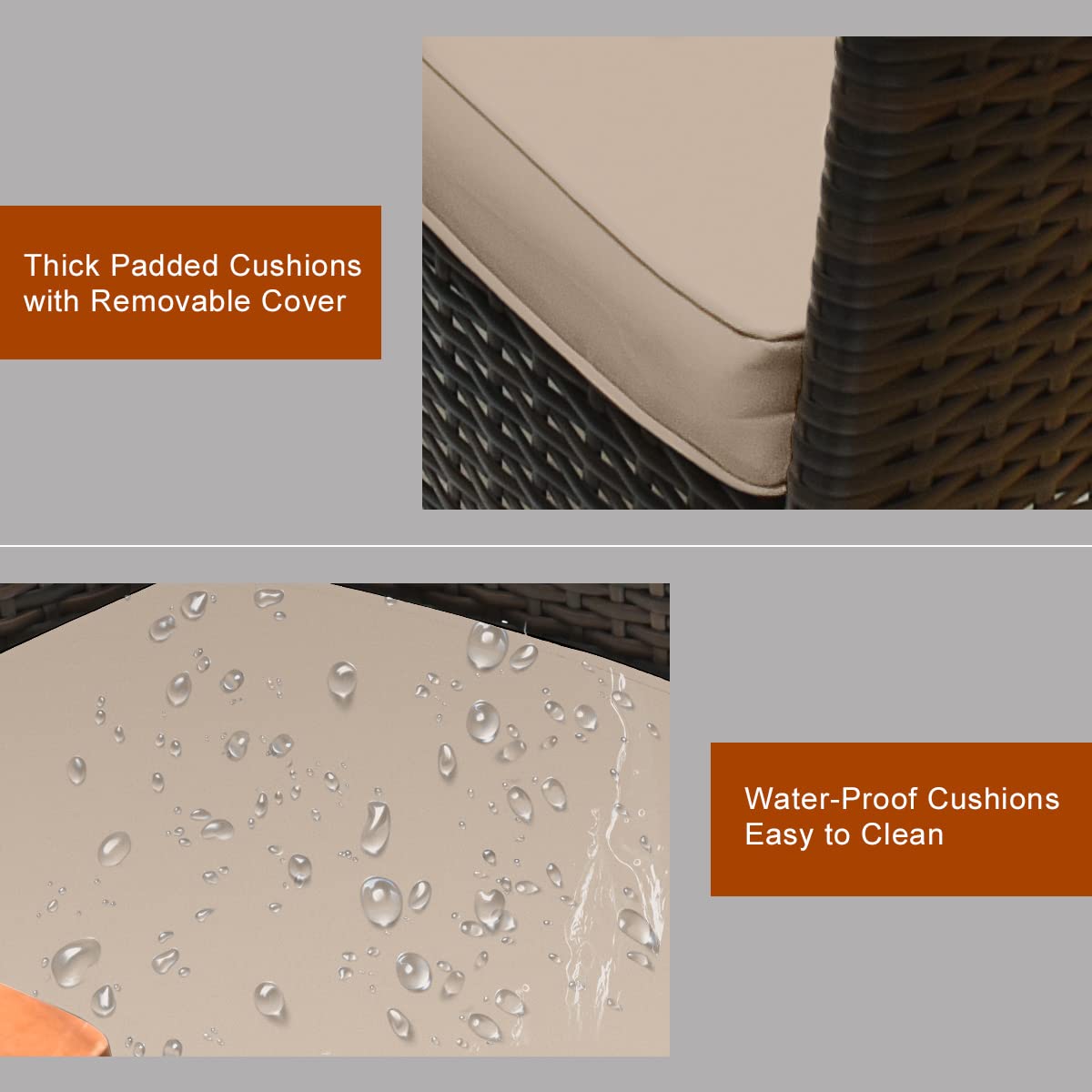- Water-proof & Soft Padded Cushions: For adding comfort, we prepare a soft padded cushion for each chair. These cushions are made of durable non-woven fabric with waterproof coating and thick sponge, so these cushions of patio dining set are cozy and suitable for outdoor use. Besides, the cover of cushion with smooth zipper is removable and washable.