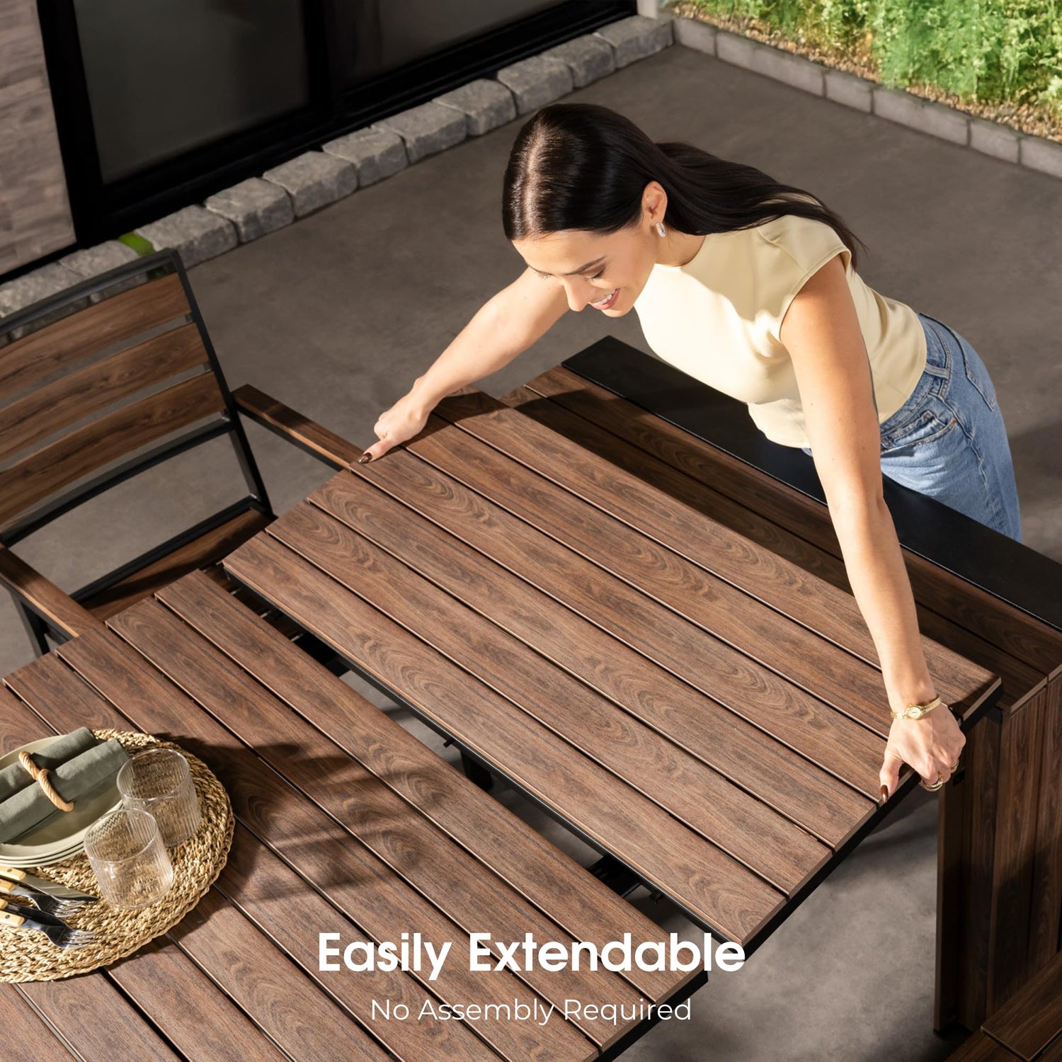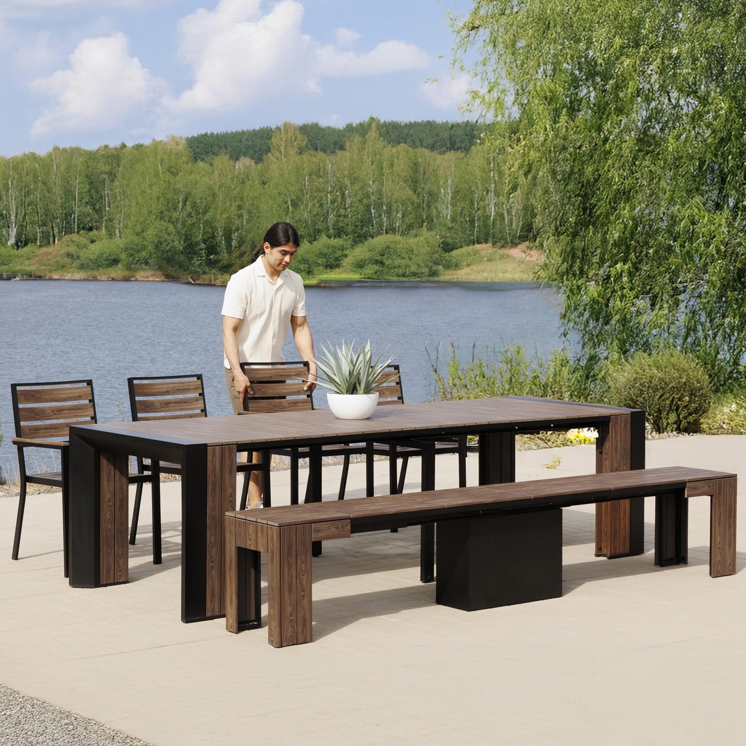 - ✅ Expandable & Space-Saving Outdoor Table Set: This patio dining furniture features an adjustable table that extends to seat up to 12 people or folds into a small outdoor table for smaller spaces. A bench is included that has self storage capacity for expandable panels.