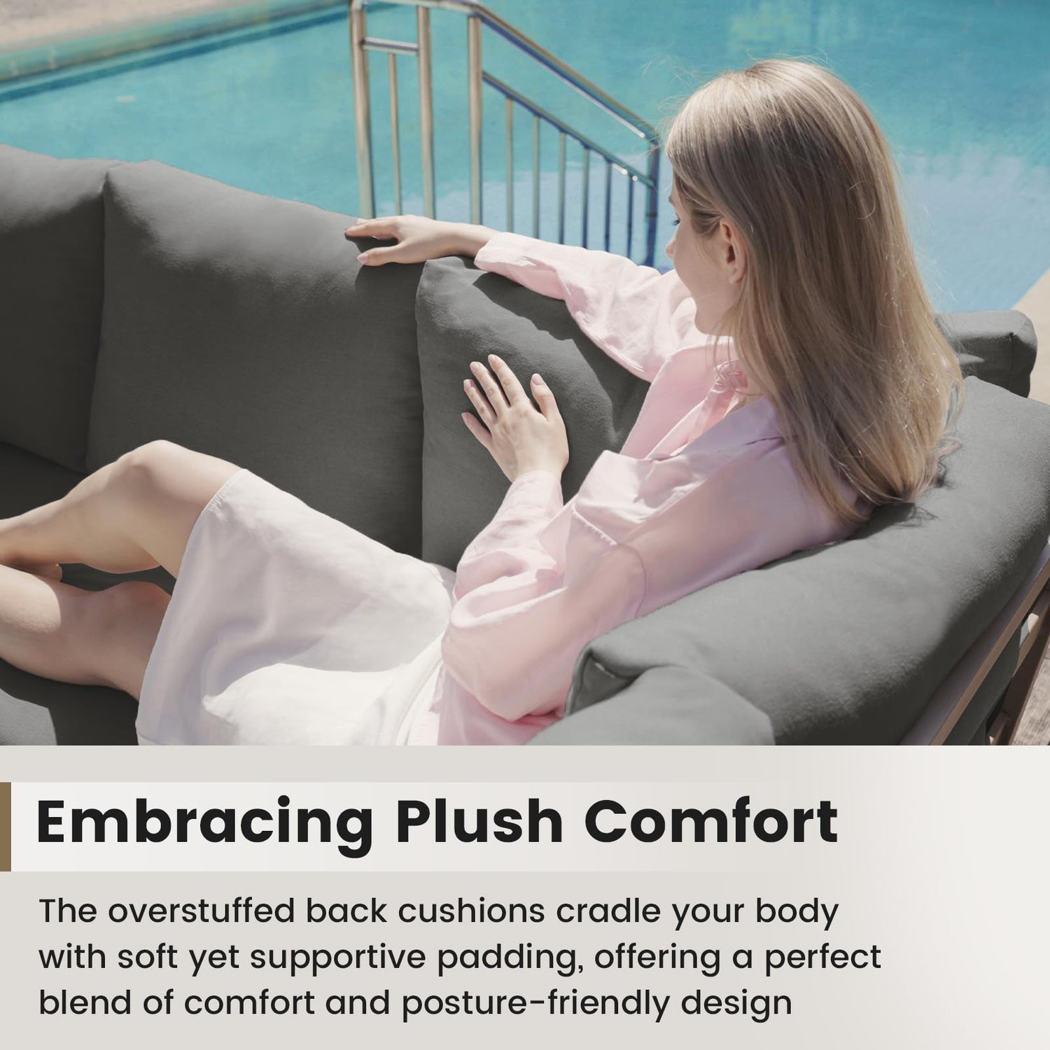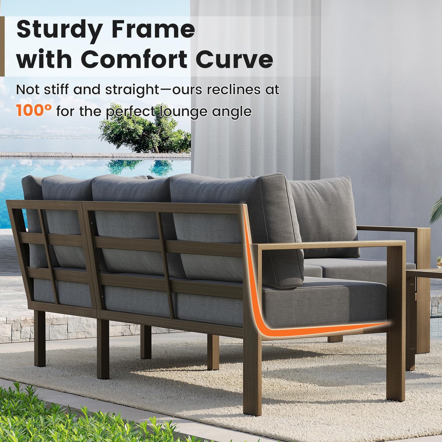 - Tough Frame with Faux Wood Finish: This outdoor patio furniture set features a stylish faux wood grain finish on powder-coated wrought iron, combining the look of wood with the strength of metal. This finish protects against rust, scratches, and weathering—extending the outdoor sectional furniture lifespan with minimal upkeep.