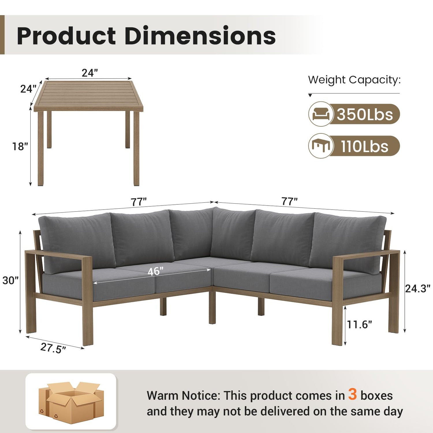 - Easy to Assembly: Delivered in 3 boxes, this outdoor furniture set includes 1 L shaped cuoch, 1 coffee table, 5 seat cushions, and 6 back cushions. It comes with a detailed instruction manual, making setup simple and stress-free. The setup takes about 30 minutes for two people.