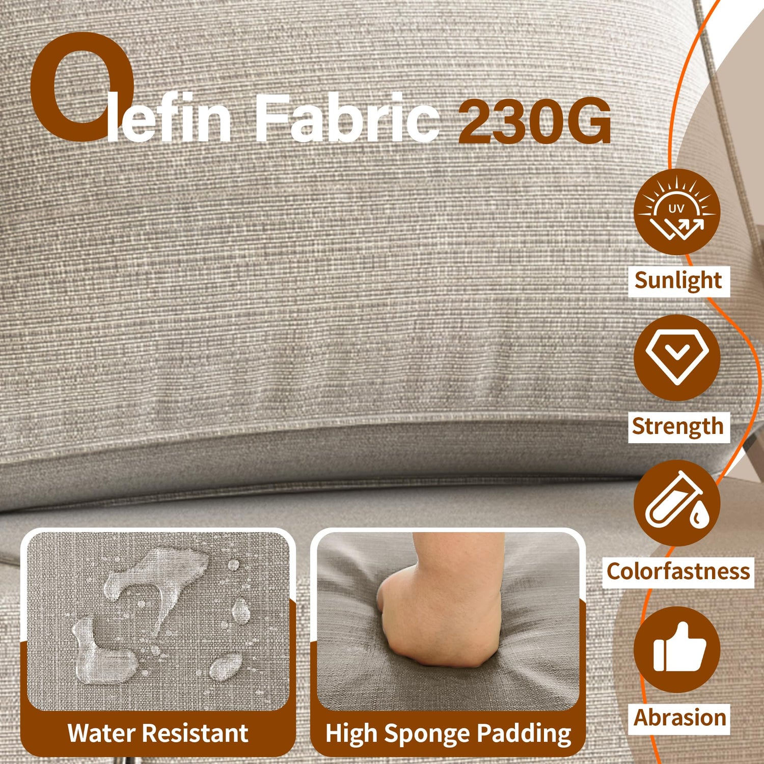 - Upgrade Comfort, Enjoy full-body Relaxation: with sofa's oversized seat depth that measures 22.5 inches. Sink into the 6 inch thick sponge seat cushion and 5 inch back cushion that perfectly conforms to your body's curves. Our cushion cover is made of upgraded Olefin fabric. which is superior to polyester fabric in terms of sun protection - colorfastness. Inside is filled with 28D soft and elastic sponge for unparalleled comfort.