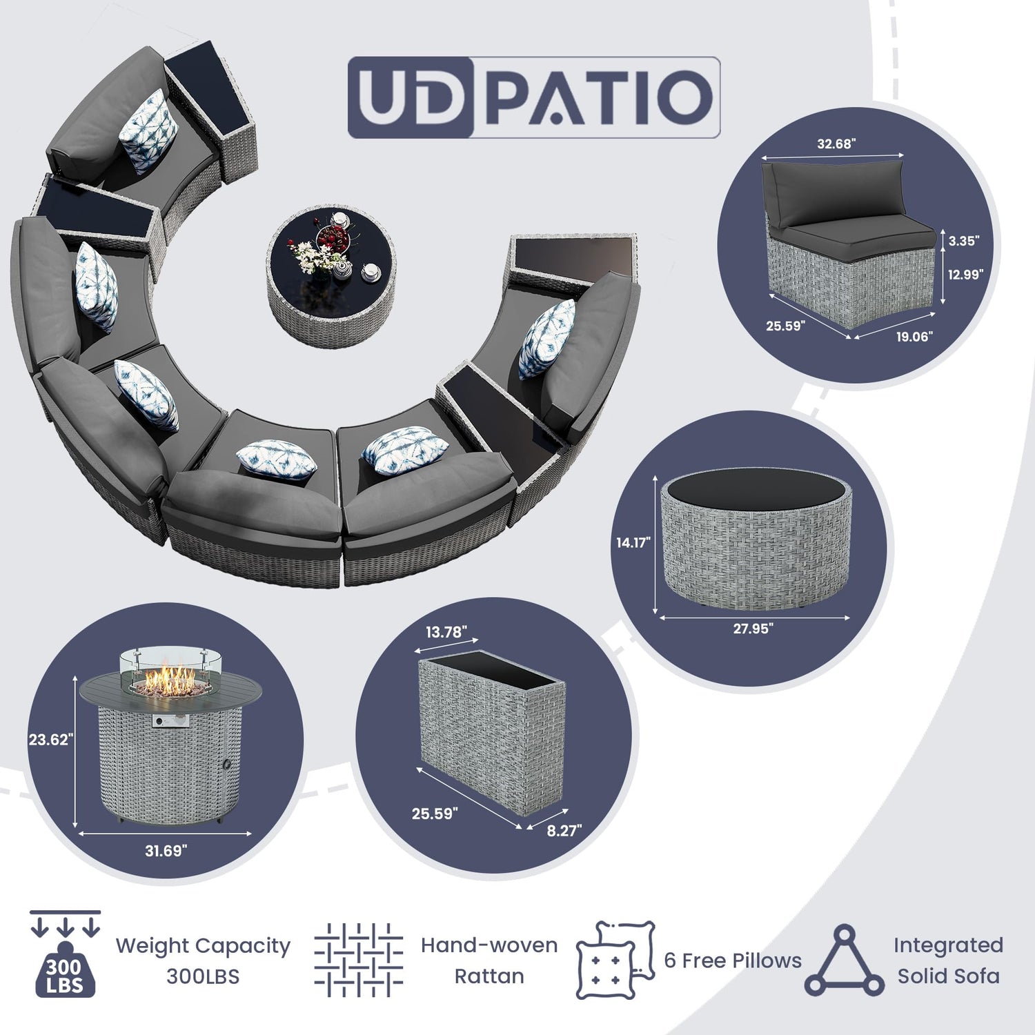 UDPATIO Patio Furniture Set,Fully Assembled Outdoor Sectional Sofa,Half-Moon Curved Modular 7 Pieces Heavy Duty Wicker Furniture Set with Round Coffee Table, for Porch,Backyard,Grey