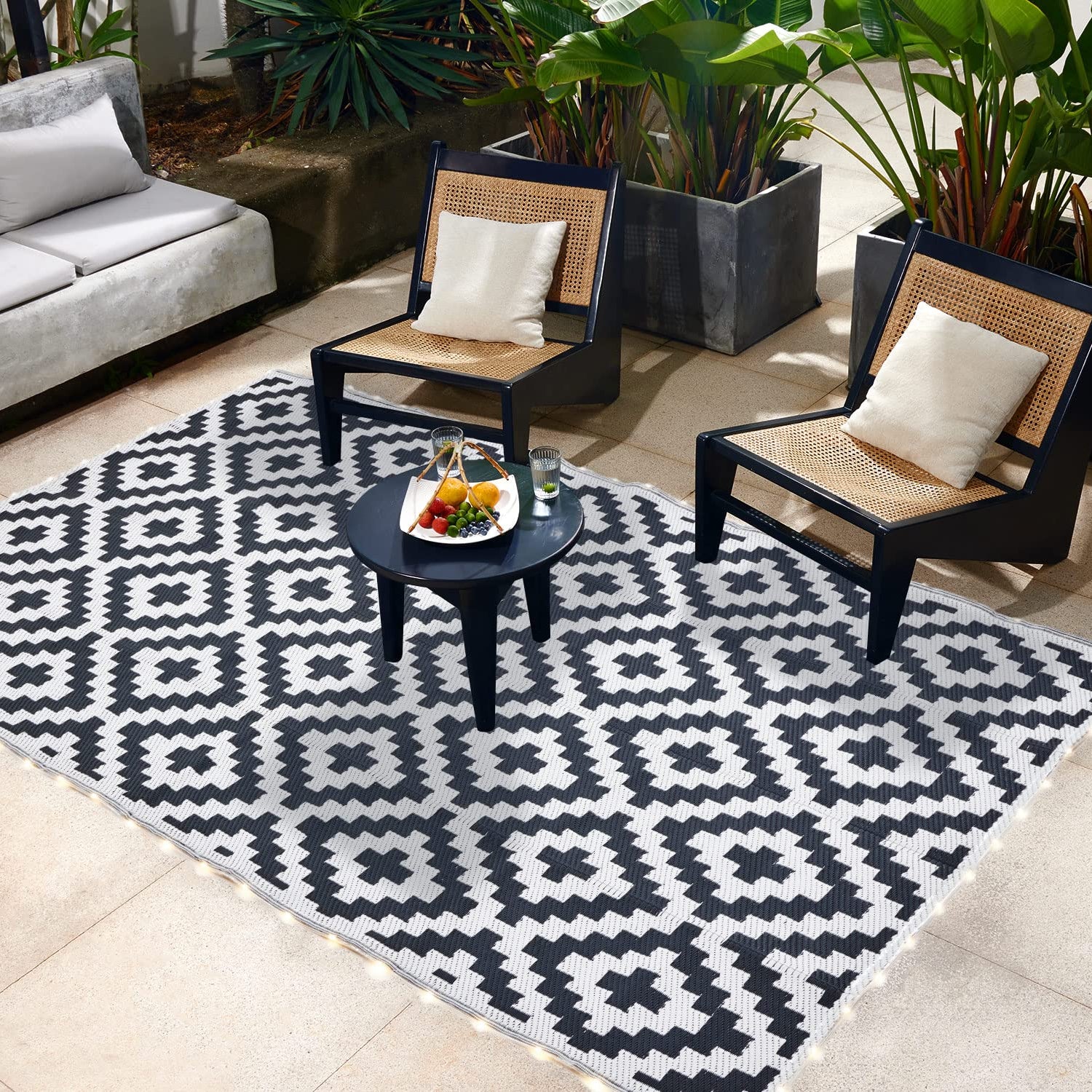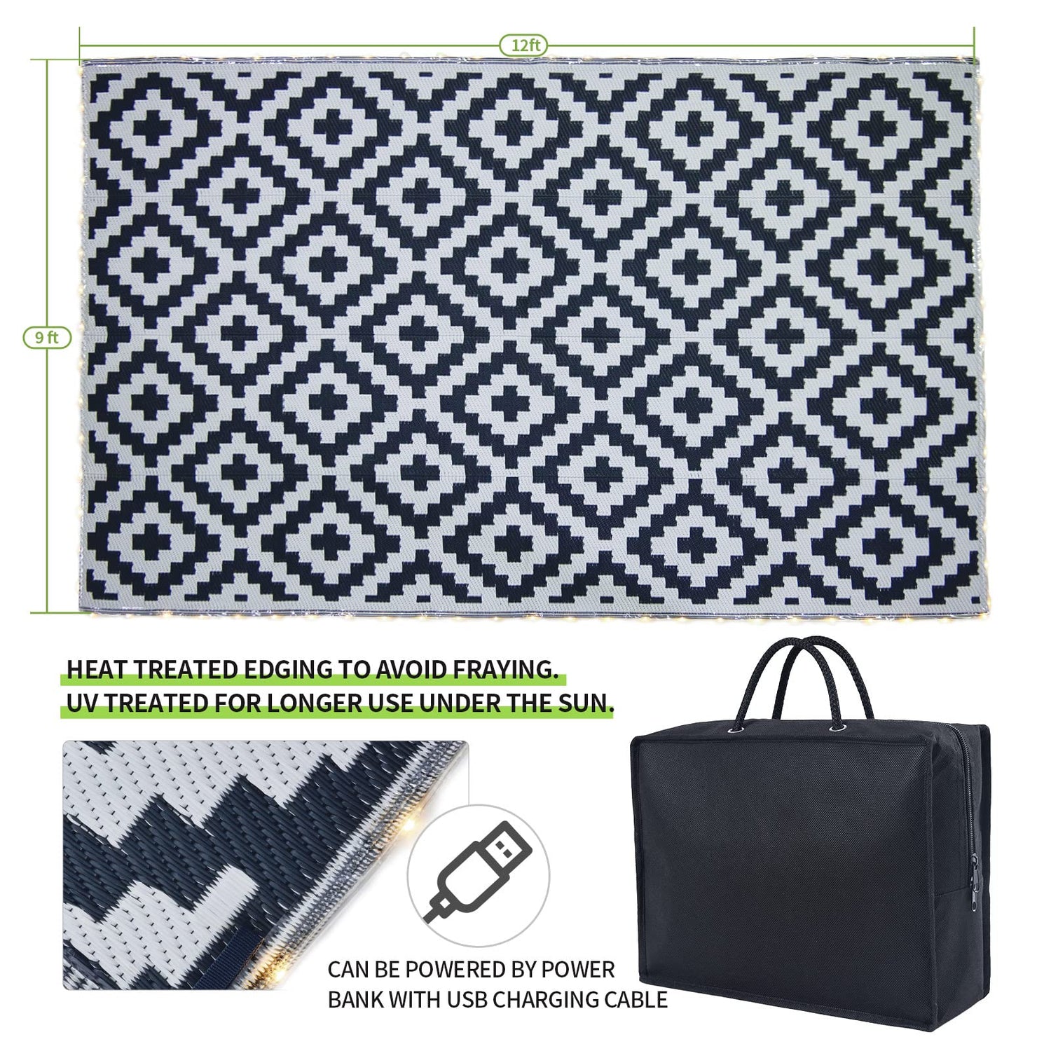 URBEST Outdoor Camping Mats Rugs Reversible Waterproof RV Deck Porch Plastic Rugs Led Illuminated Patio Mat Black-White 9x12 Feet