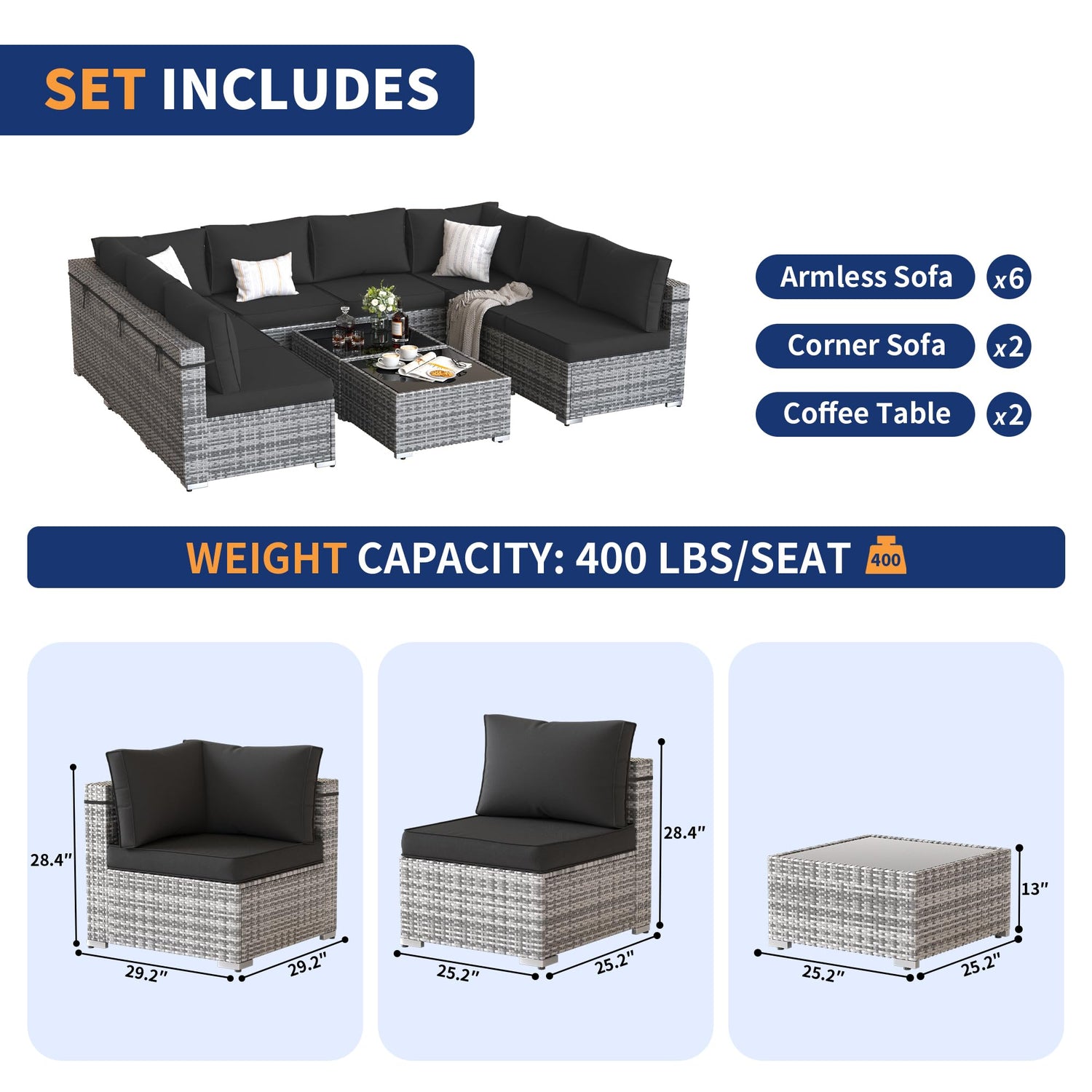 VONZOY Patio Furniture Set, 10-Piece Outdoor Sectional with Free Cover, All-Weather Wicker Patio Conversation Sets for Backyard (Grey with Black Cushion)