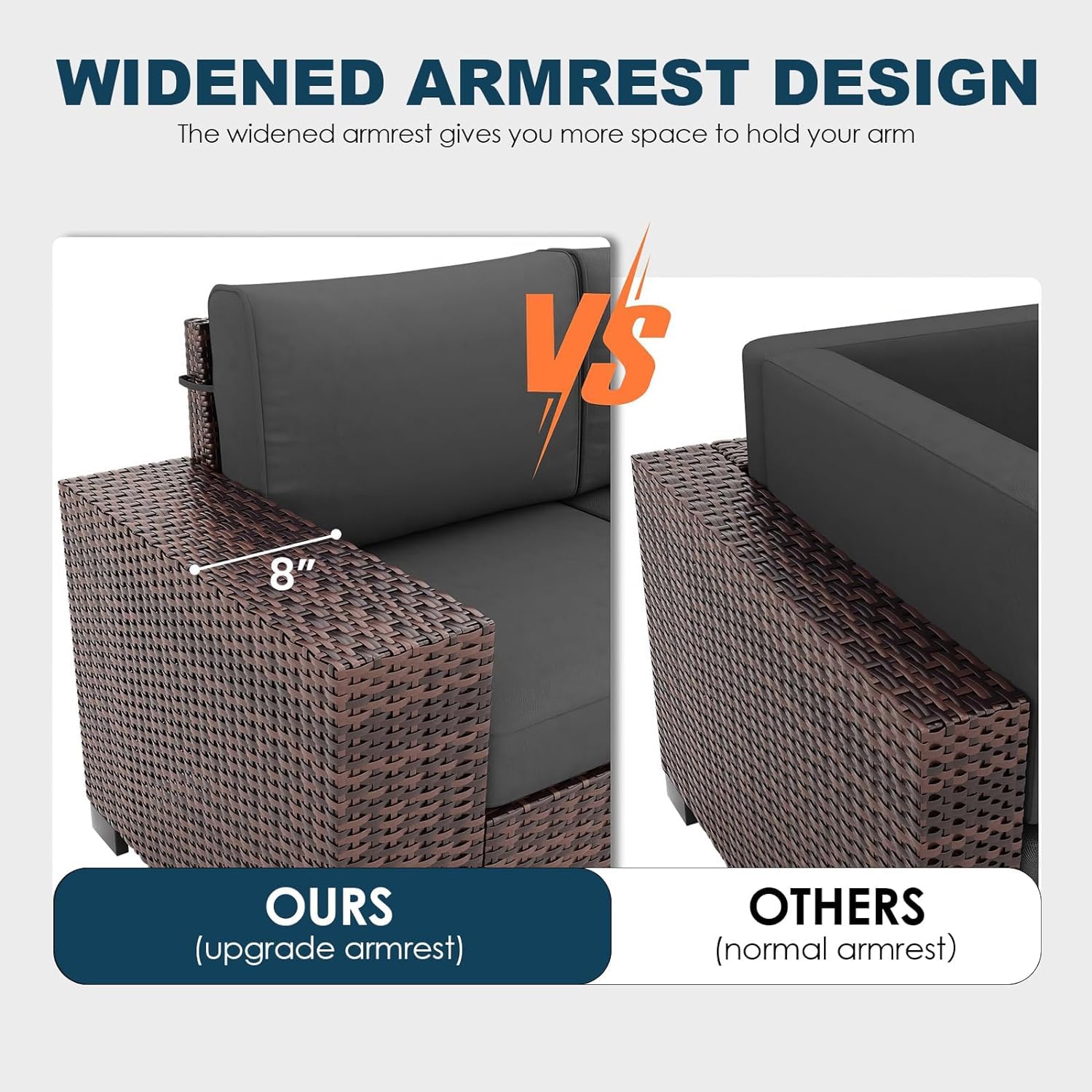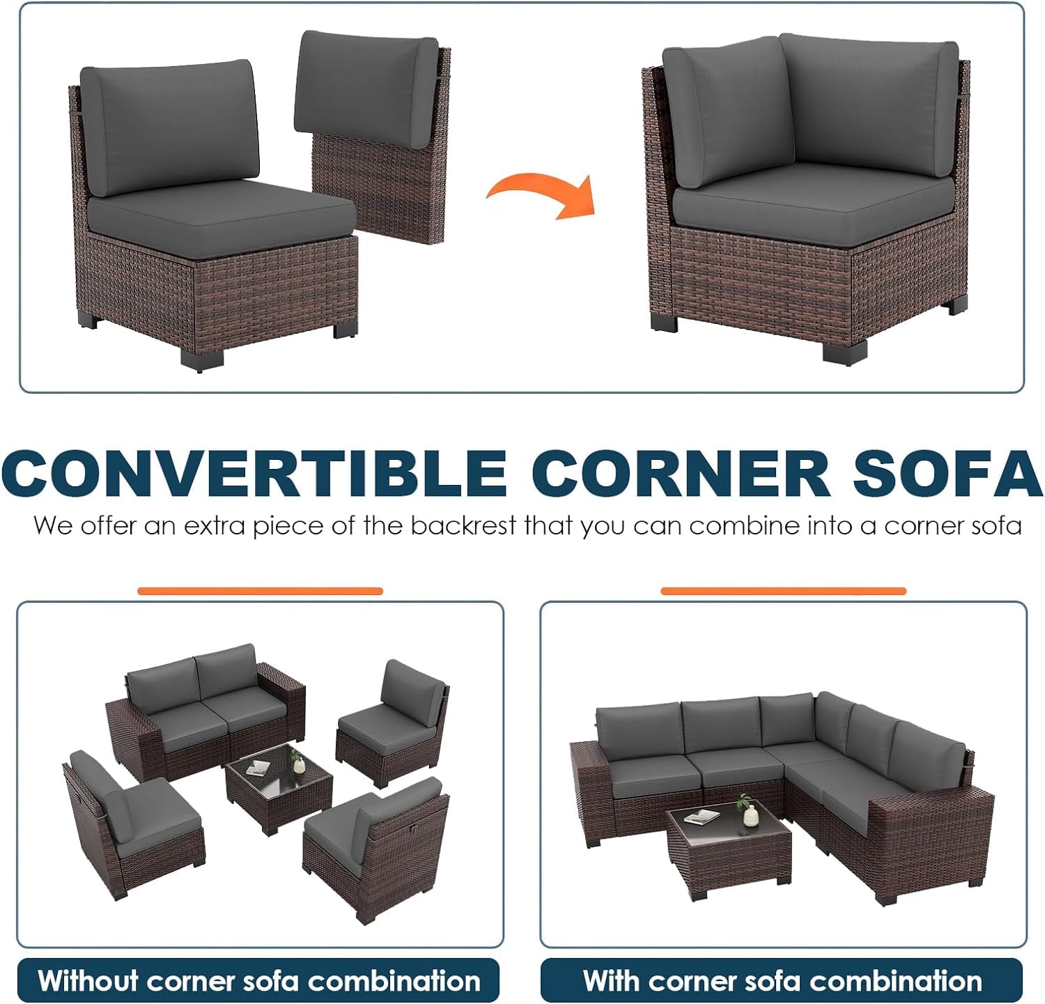 - 【Convertible Patio Furniture Set】Designed for mobility and adaptability, this patio furniture features 1 left-arm sofa, 1 right-arm sofa, 2 armless sofas, 1 tempered glass coffee table, and 1 convertible corner sofa with an extra backrest. Seamlessly transform the corner sofa into an armless configuration, allowing you to effortlessly customize your seating arrangement as desired.