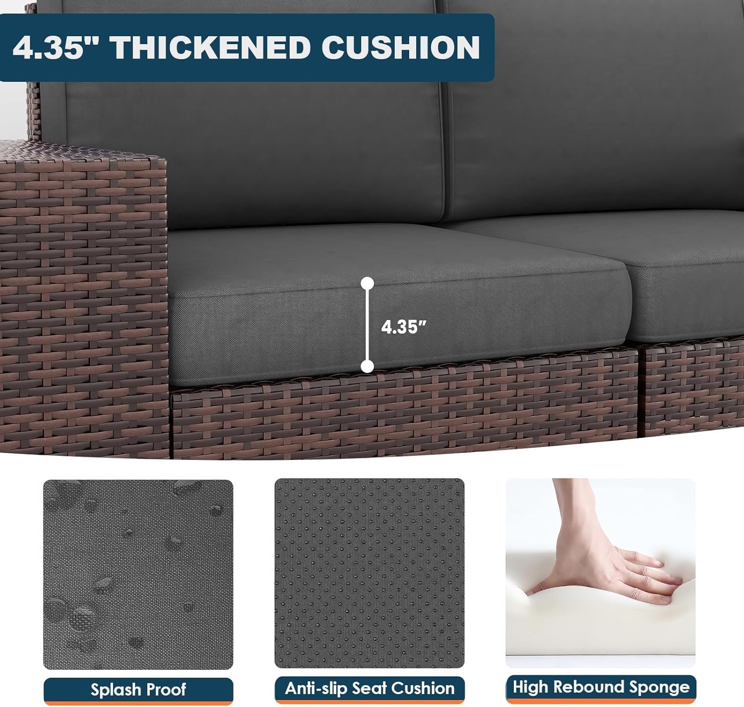 - 【Comfortable and Removable Cushions】Our cushions are made of 100% polyester fabric, water-repellent, and long-lasting. Filled with a premium 4" sponge to stay fluffy and non-deformation, while the washable covers ensure effortless maintenance, elevating your outdoor relaxation experience.