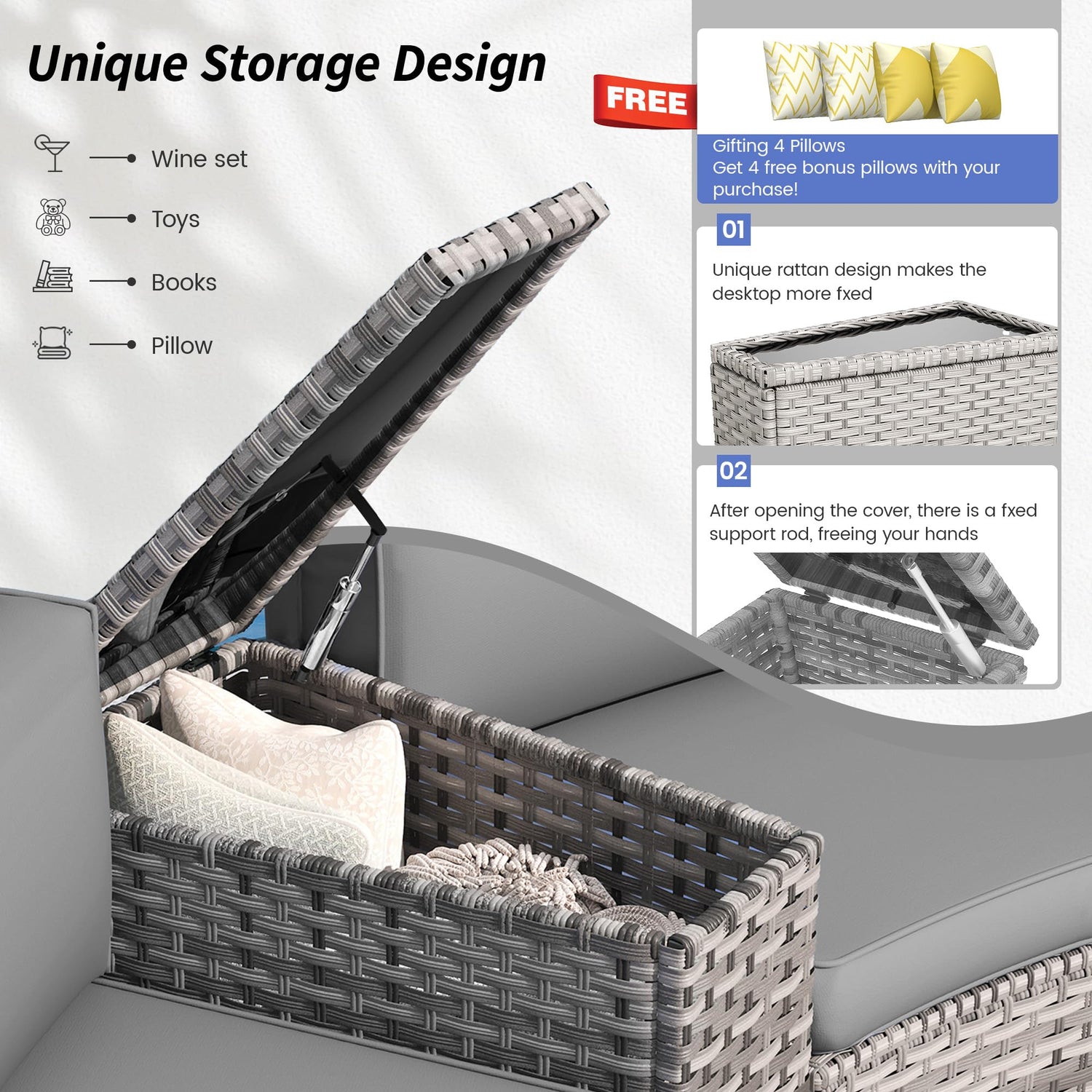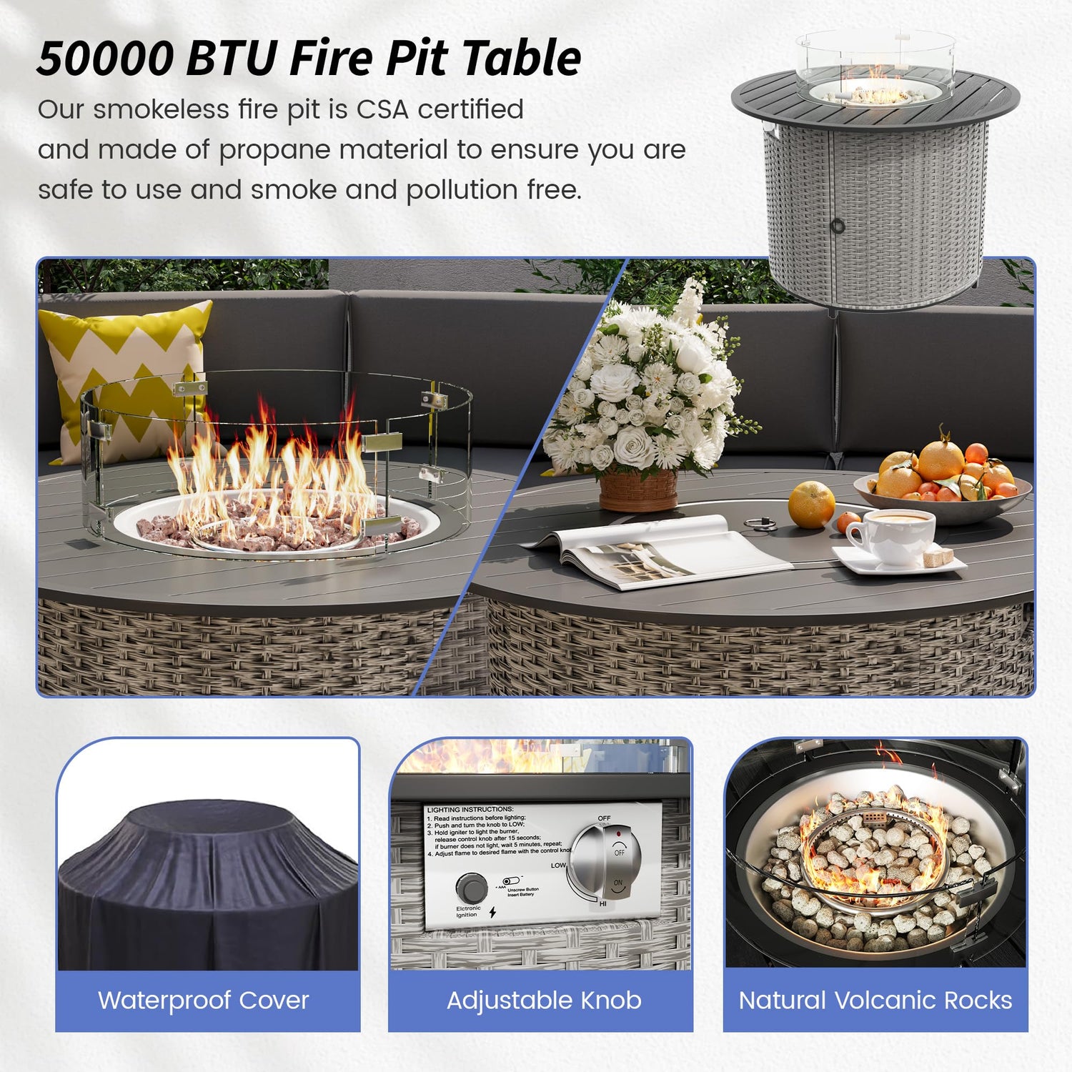 VONZOY Patio Sectional Furniture Outdoor 12-Piece Grey Rattan Curved Sofa Set with Fire Pit Table,Storage Table,Pillows,Fit for Pool Backyard Balcony Porch Lawn (Grey)