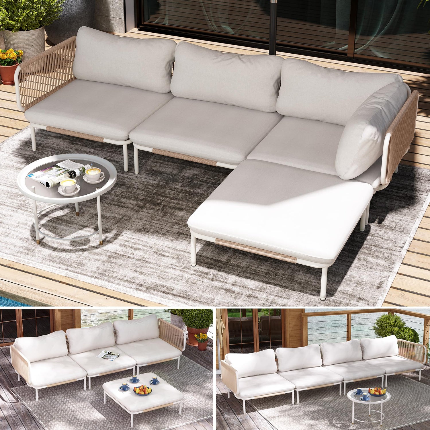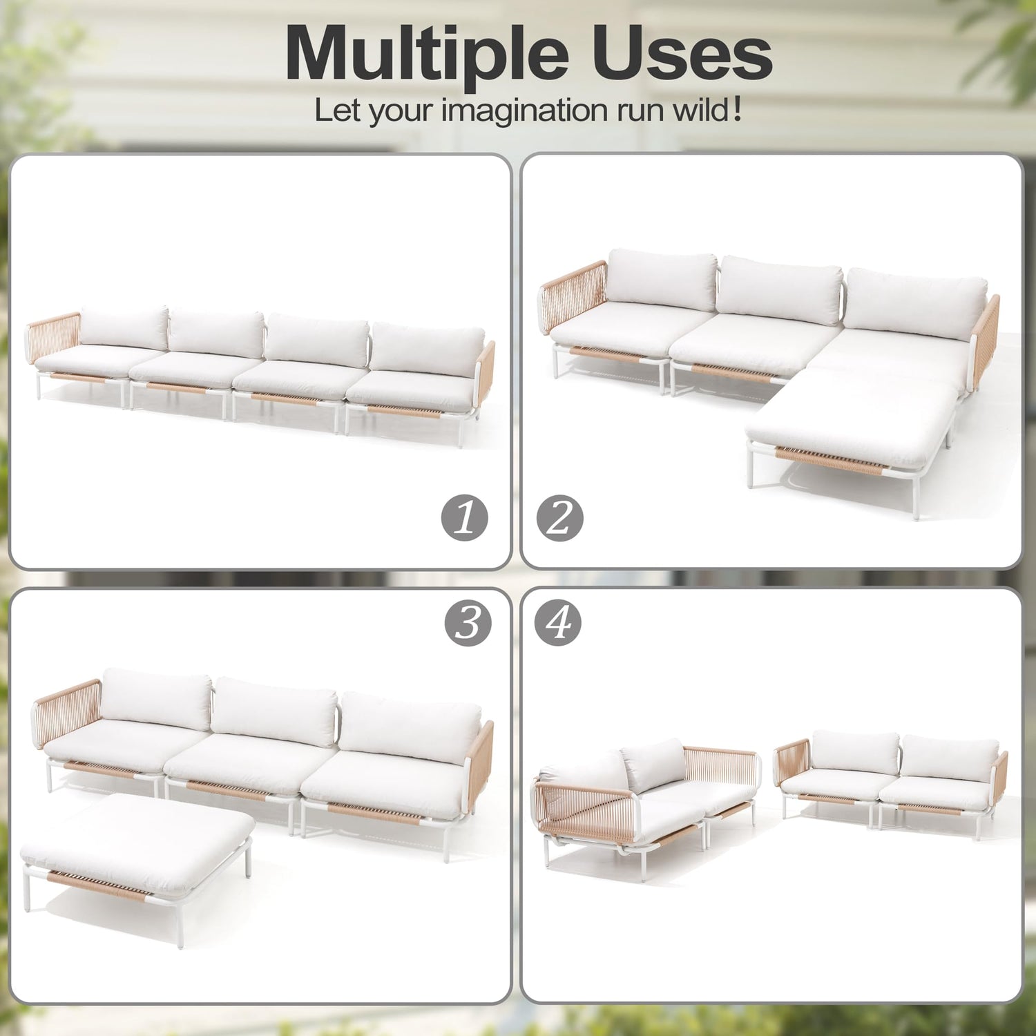 VredHom Patio Furniture Set, Outdoor Patio Furniture Oversized Metal Patio Sectional Sofa, 4-Seat Conversation Set with Cushion for Indoor and Outdoor, White Frame & Beige Mat (4 Seats 8 Armrests)