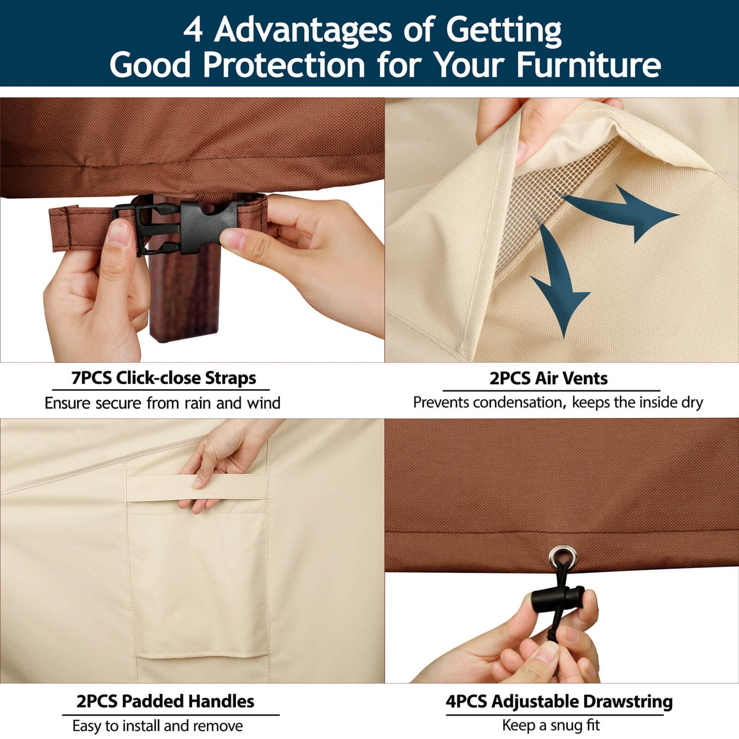 - Windproof Patio Sectional Cover: Our patio furniture covers comes with 7 click close straps fastened to the sofa legs to keep it in place in during high winds, and 4 elastic hem cords that can be freely adjusted to make your outdoor sofa cover fit like a glove with a perfect fit. It also comes with 2 Air Vents for air circulation, which effectively reduces the accumulation of condensation and wind lofting , keeping your sofa dry