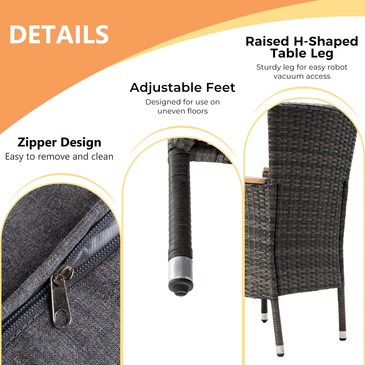 - 【Comfortable Cushioned Seating】Each chair includes a thick, high-resilience foam cushion wrapped in polyester fabric that resists both water and abrasion. The removable zippered cushion covers make cleaning simple, so you can enjoy comfort without the hassle.