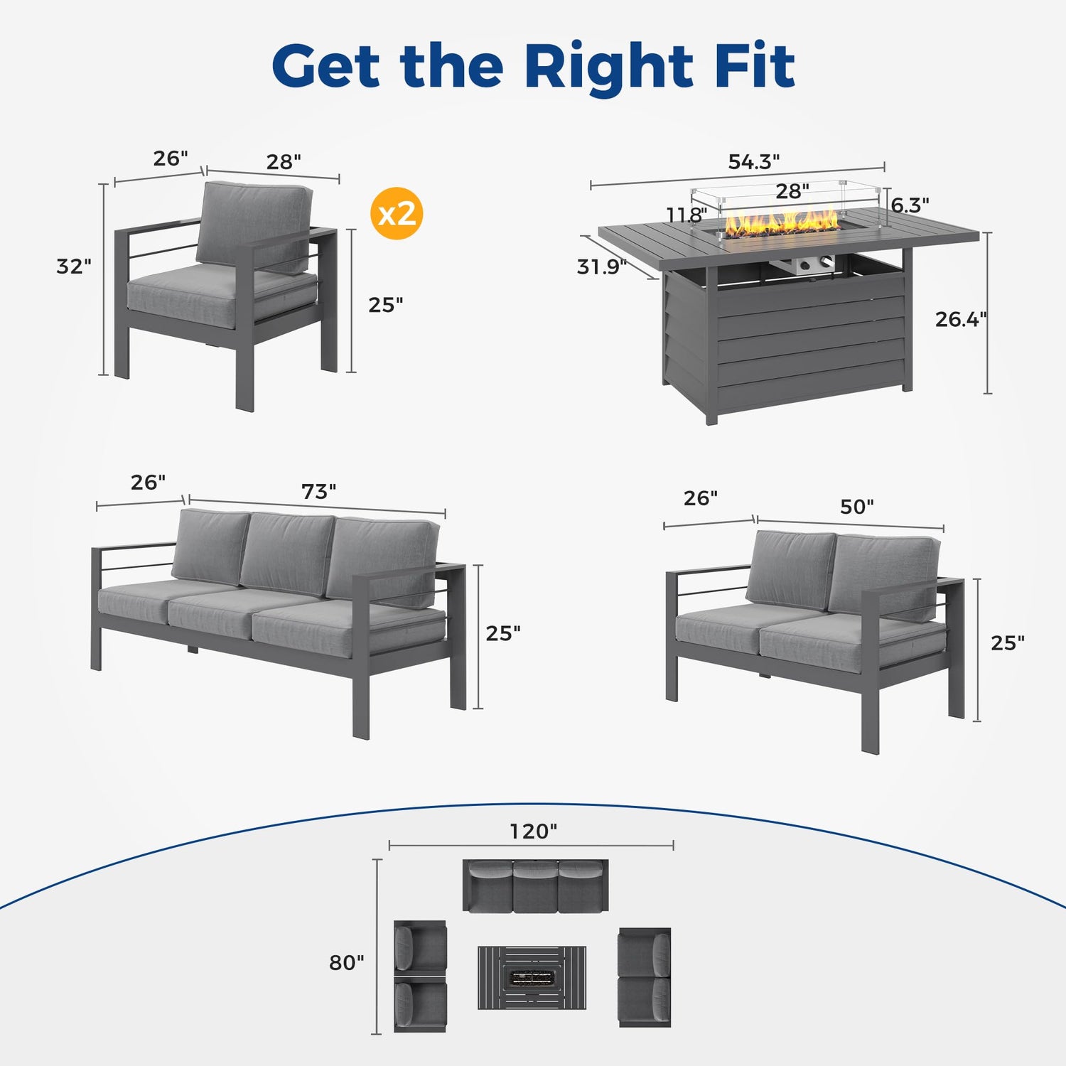 Wisteria Lane 7 Seats Aluminum Outdoor Patio Furniture Set with 54 Inch Propane Gas Fire Pit Table, Modern Patio Conversation Sets with Outdoor Sectional Couch for Backyard, Garden, Dark Grey