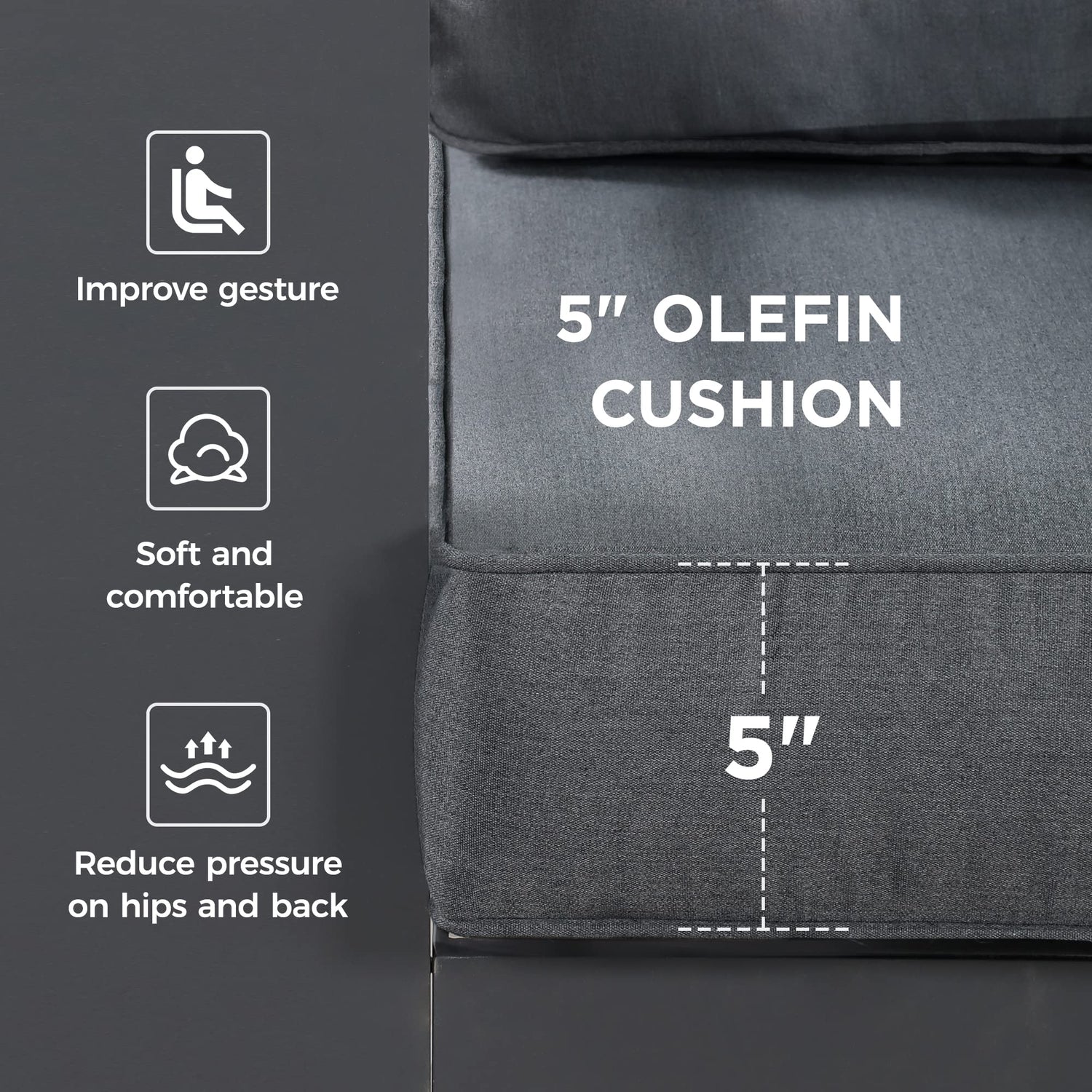 - 【5-INCH OLEFIN CUSHION】Covering the top of the outdoor furniture baseplate, the piped cushions provide 5-inch padding as you sit. Thickened at the waist, the foam-filled cushions encourage proper posture while you sit. Each cushion of the outdoor patio set is wrapped in Olefin fabric, so it's sure to stand up to UV rays beaming down when left outdoors.