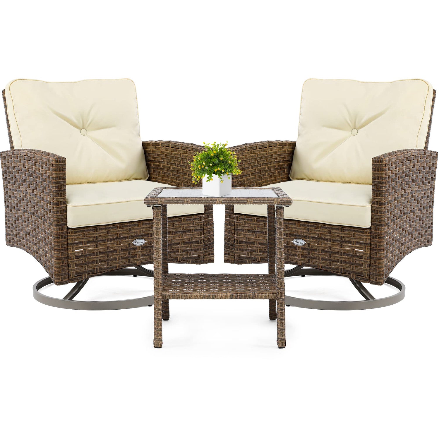YITAHOME 3-Piece Patio Wicker Swivel Chairs, Outdoor Small Furniture Rocking Coversation Chairs w/Thick Cushions and Table for Garden, Backyard and Balcony (Tan Chairs + Off- White Cushions)