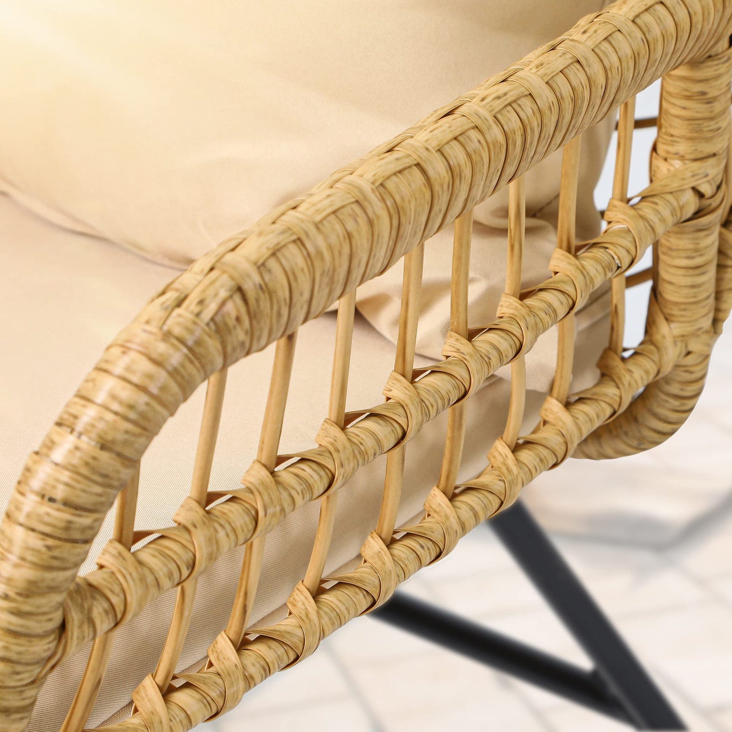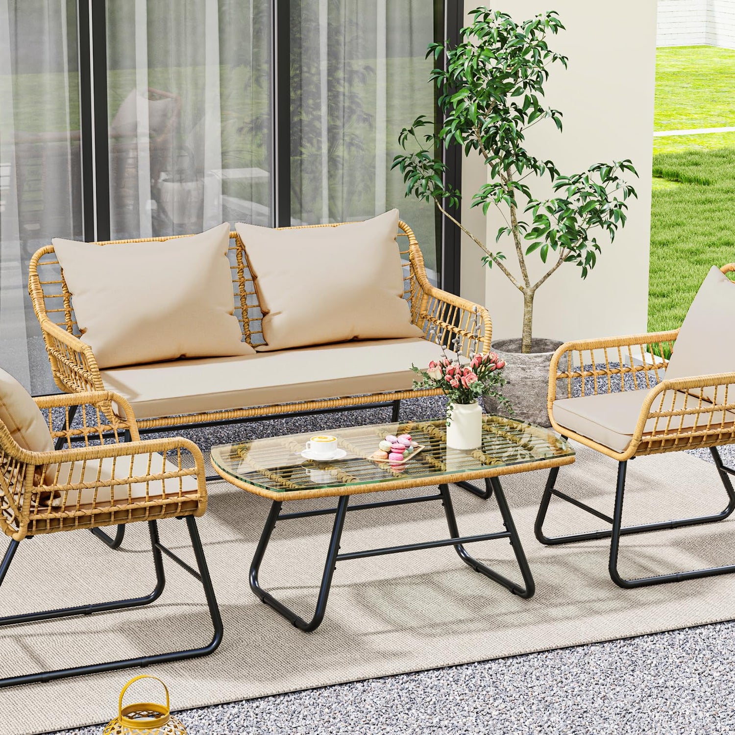 YITAHOME 4-Piece Patio Furniture Wicker Outdoor Bistro Set, All Weather Rattan Loveseat Conversation Sets with Soft Cushions and Glass Side Table for Backyard, Balcony and Deck, Light Brown+Beige