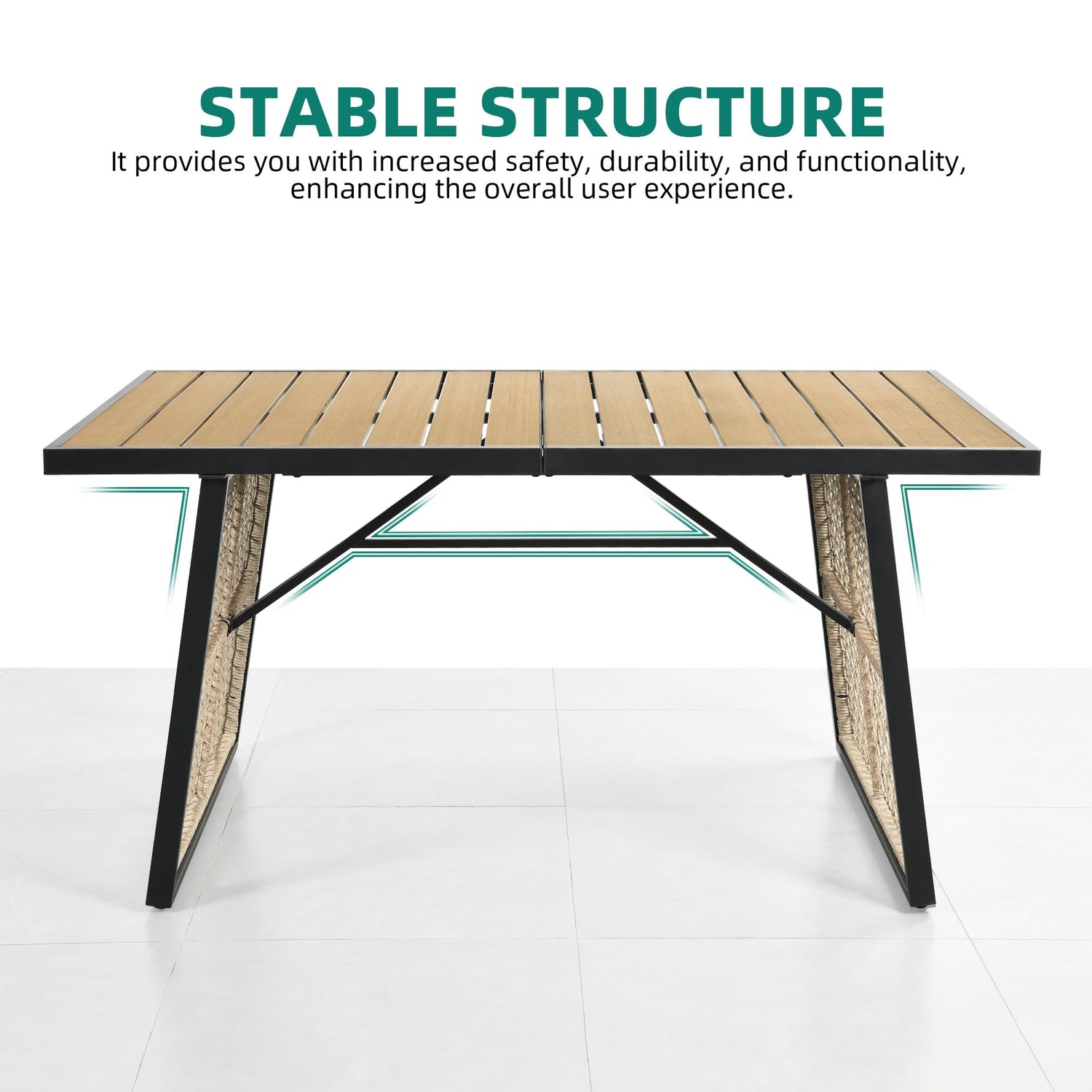 - ALL-WEATHER TABLETOP: The plastic wood tabletop is scratch-resistant and can withstand high temperatures and all kinds of weather conditions, ensuring you can enjoy your meals without worry; Featuring gaps on the tabletop, this rectangular dining table makes it easy for water to drain away and air to circulate, allowing your table to dry quickly after rainfall or cleaning.