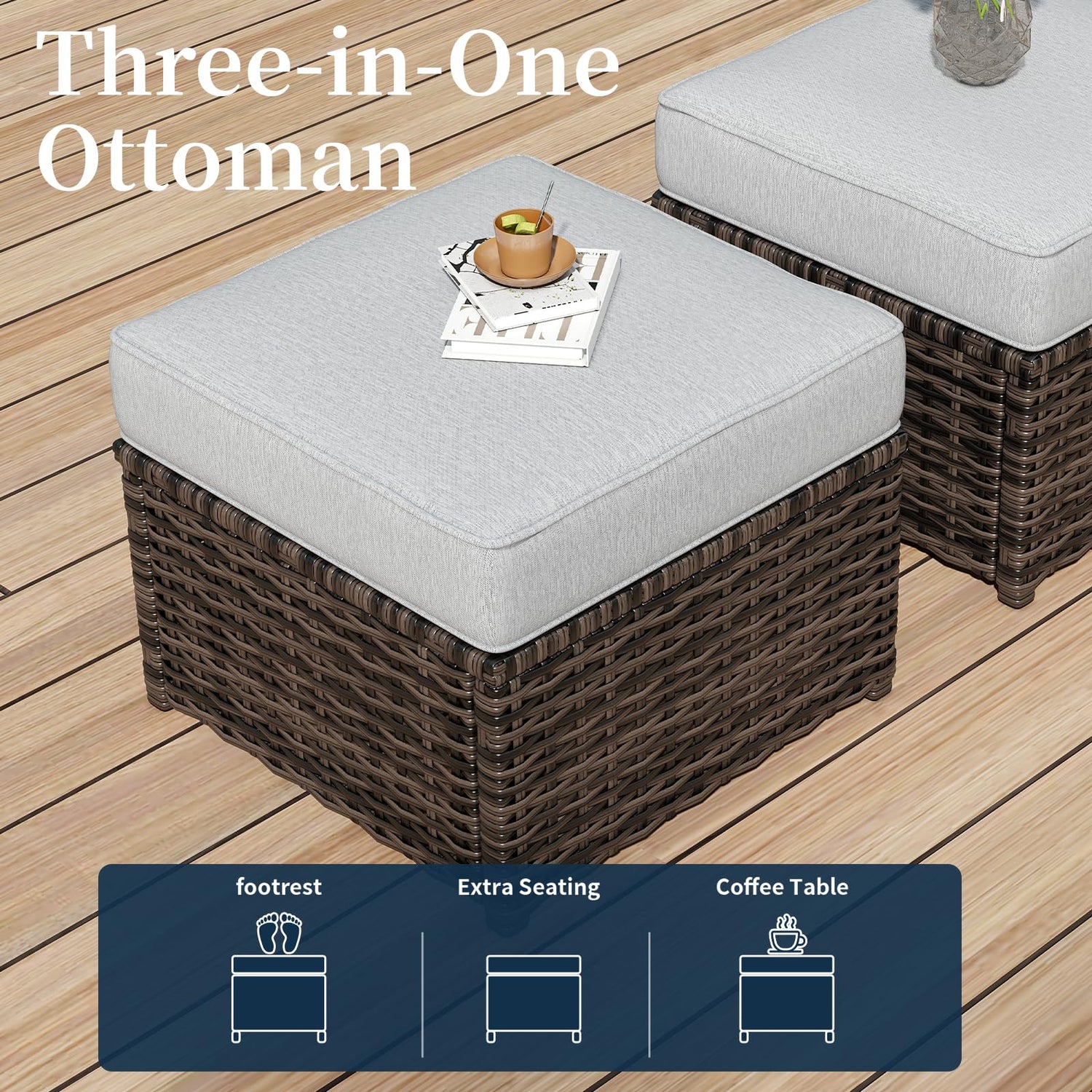 - Comfy Seating: Thick padded cushions with dense foam offer excellent comfort; Fade-resistant fabric meets level 4 colorfastness; Large ottomans serve as table or footrest for extra space